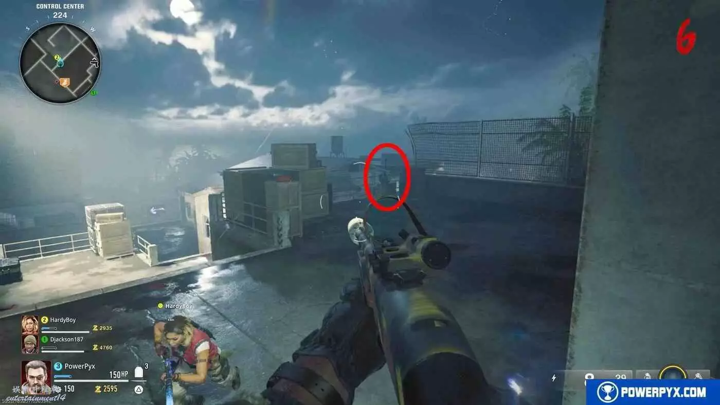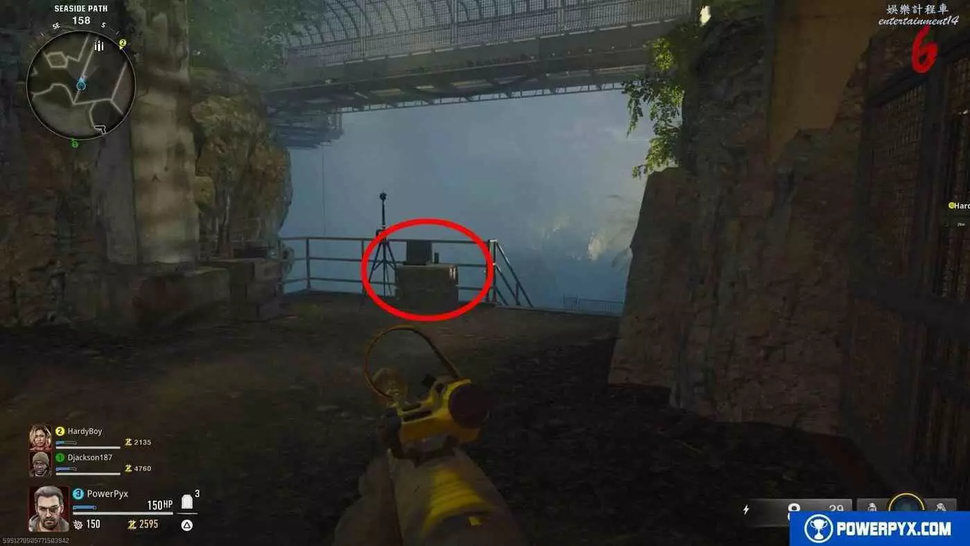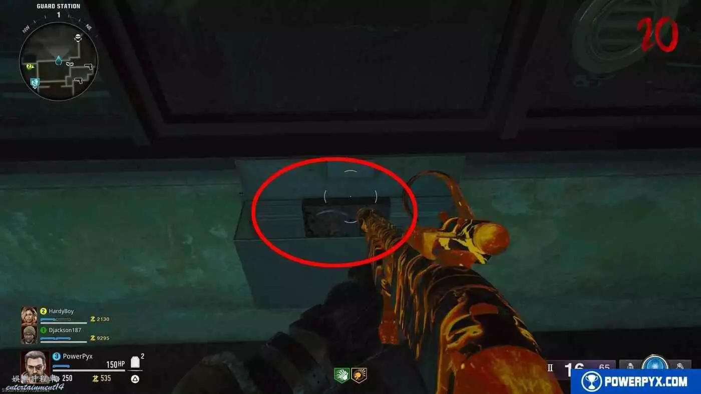 【電箱2位置】射擊第一個電箱後,立即向右旋轉90°,射擊牆上的第二個電箱,一定要在電梯經過之前迅速命中。