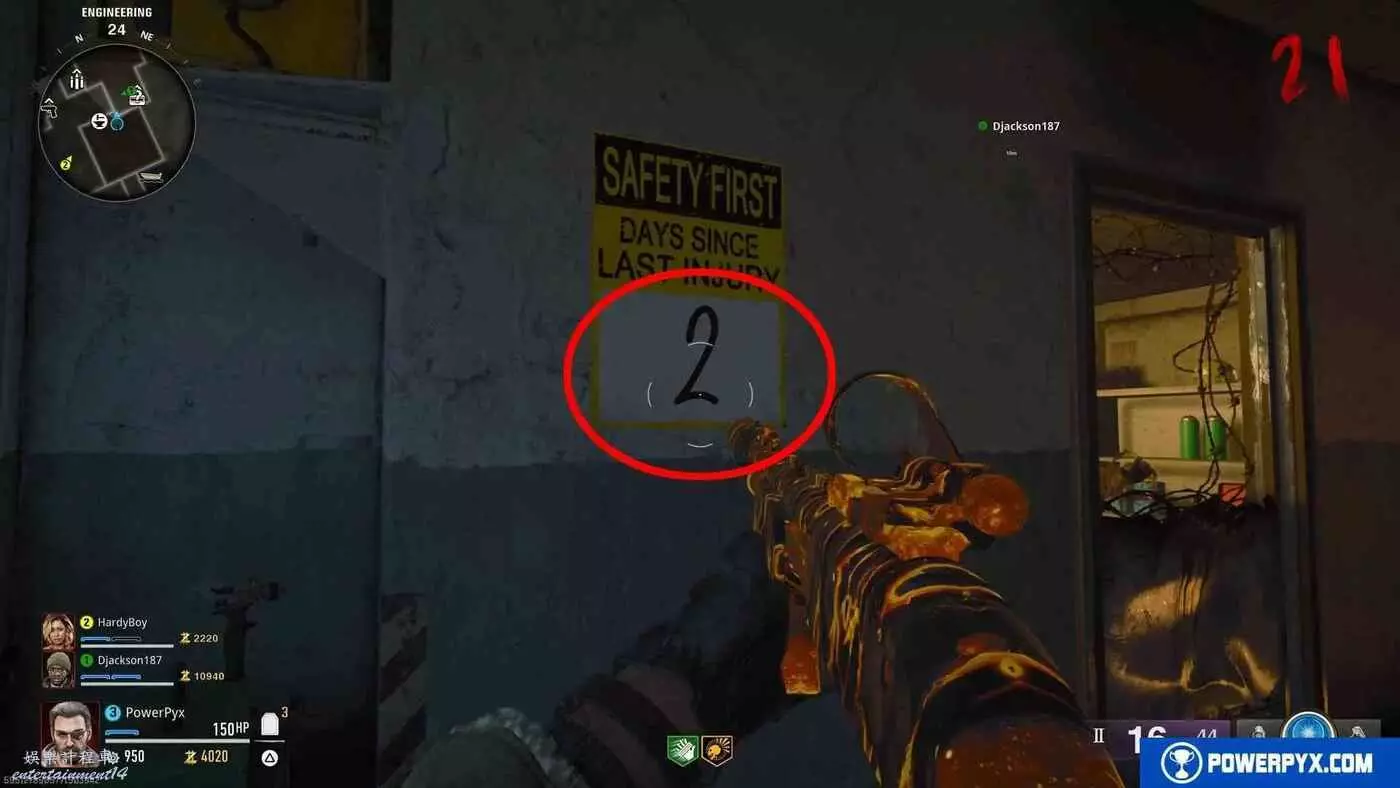 【第三個數位位置】在工程室裡,在第二台發電機所在房間和塔之間,牆角處貼著一張黃色告示,上面寫著“SAFETY FIRST”-“DAYS SINCE LAST INJURY”,然後下方是一個手寫數位,記下這裡顯示的數位。