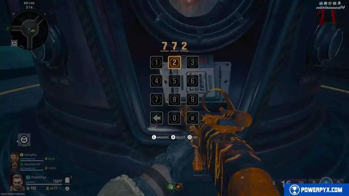 返回【步驟2.2)】中的奇跡武器工作台所在房間,在房間入口附近的右側有個電腦控制台,按住□鍵/X鍵與控制台互動,輸入正確的3個數位組合,每一局的密碼都是隨機的。