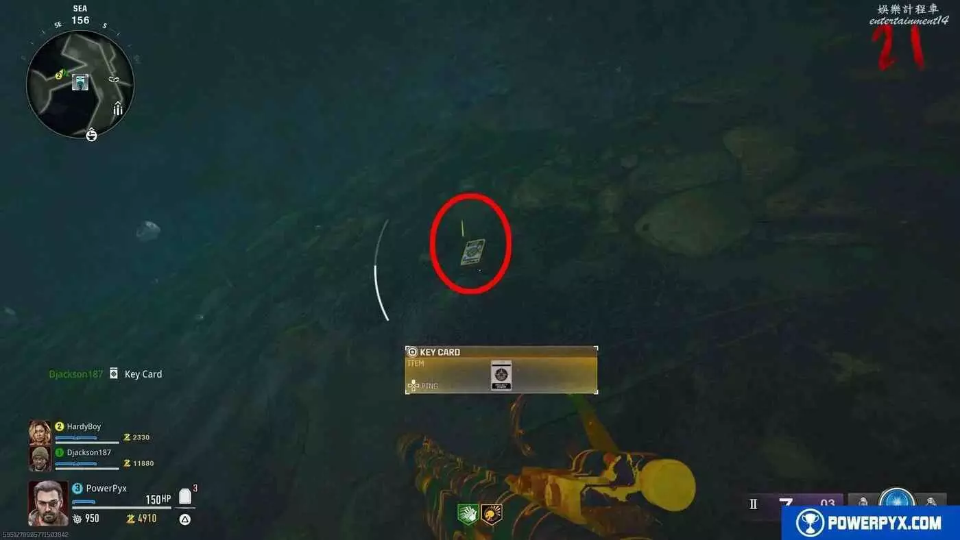 觸發精英喪屍戰後,跳入生物實驗室的水中往下潛,拾取金色道具【出入卡】。出入卡會隨機出現在水下的某個地方,但一定會在此房間的水中,需要仔細尋找。