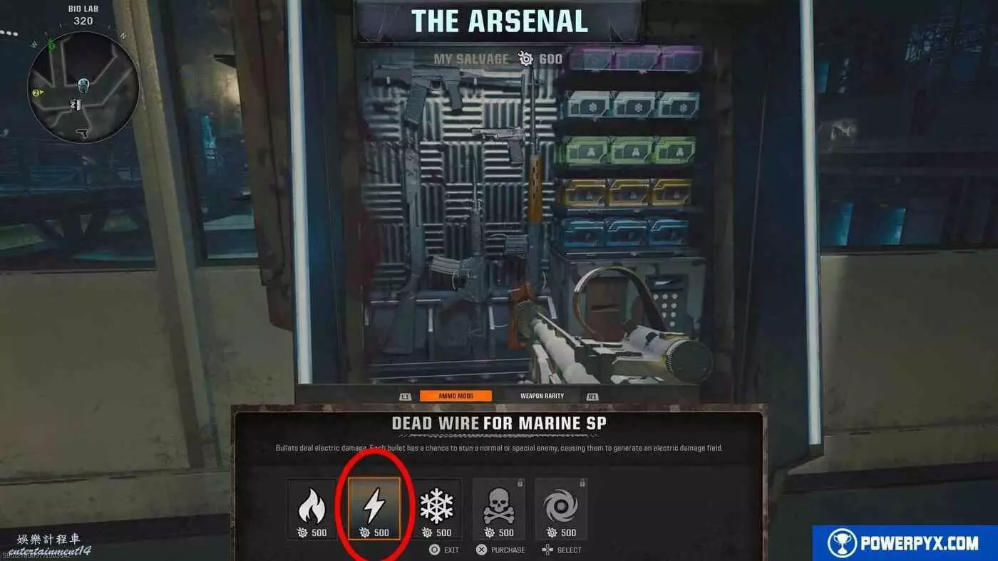 首先花費500廢料在軍械庫製作【致命電流】,就在面對強化機往左轉的位置。給武器附帶致命電流屬性。