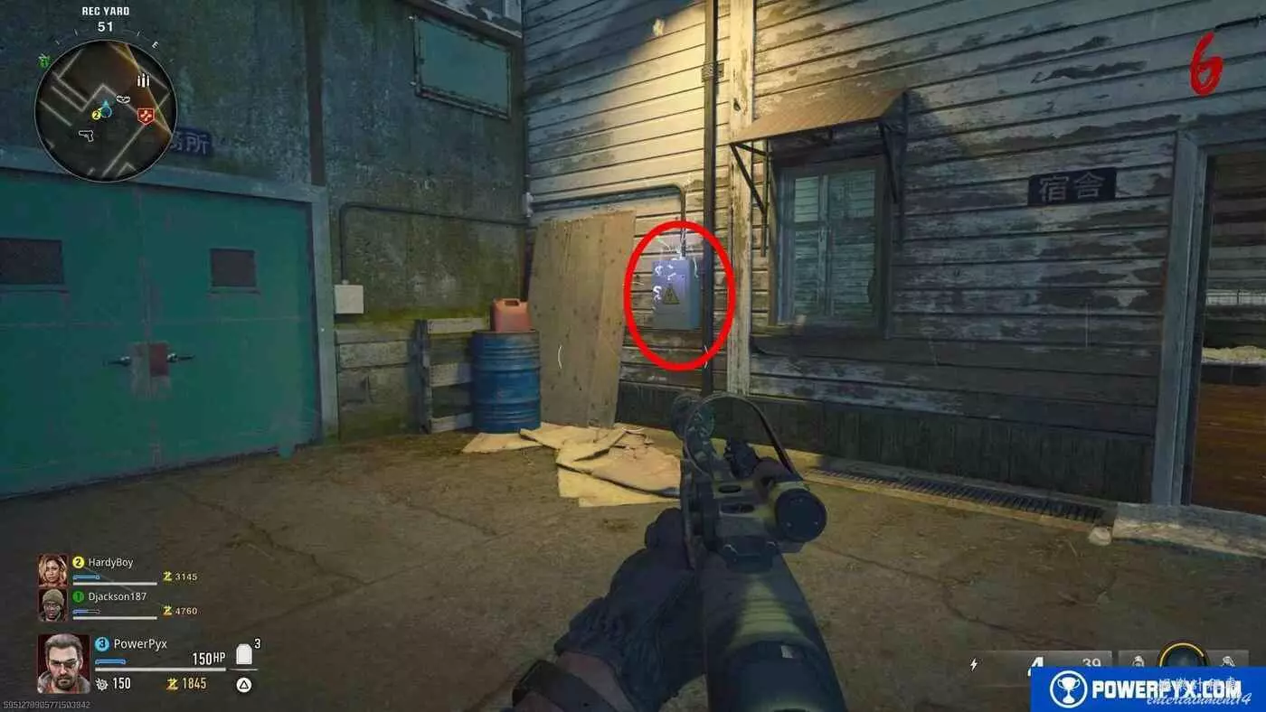 【電箱1位置】面對電梯按鈕站在按鈕右側,朝之前在此房間裡守衛的第三台發電機所在的方向看,在電梯走到一半時,通過開啟的窗戶射擊電箱。