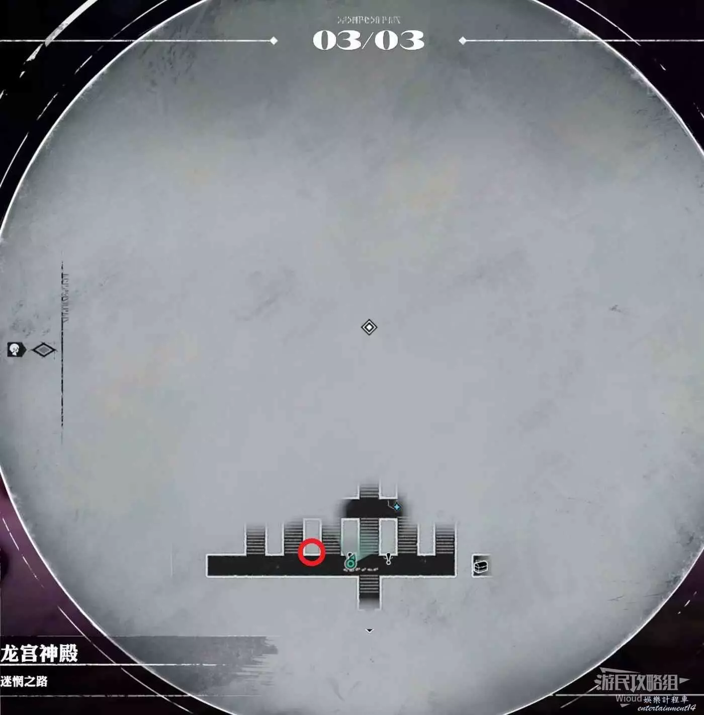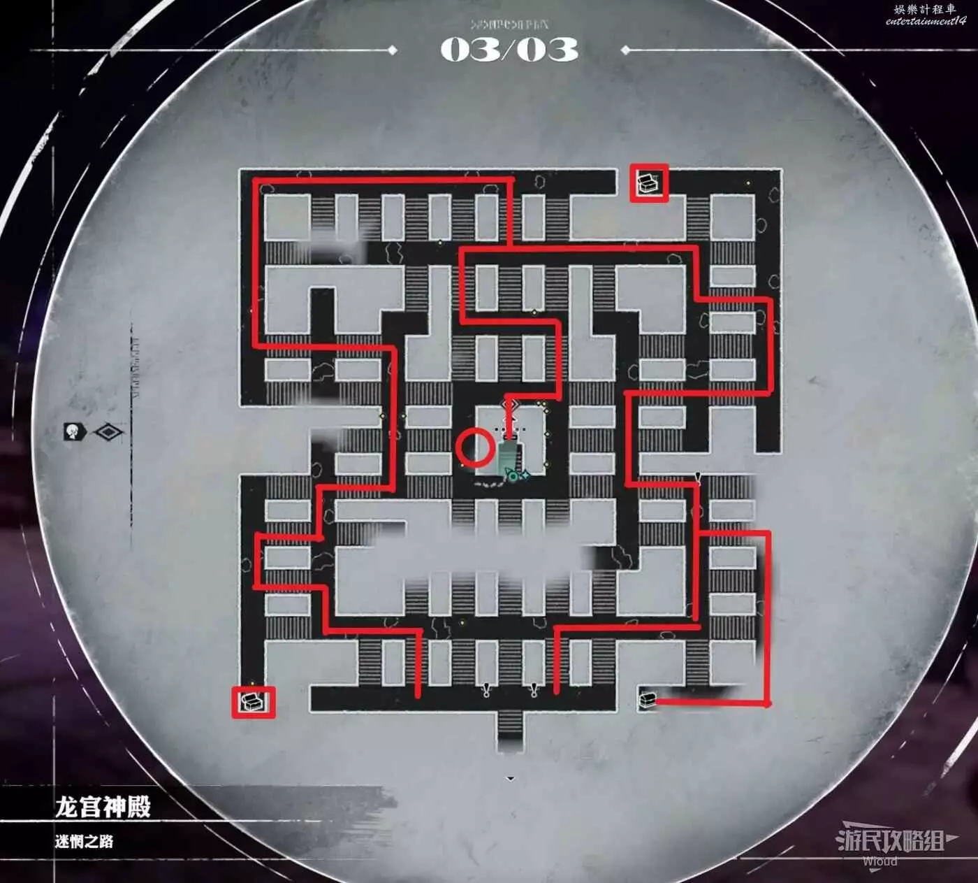 地圖左下角與右上角的寶箱都可以直接拿,右下角需要通過一個沒有指引的樓梯走過去,路線也在下圖展示出來了;
