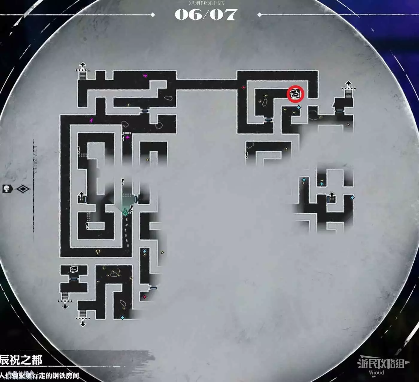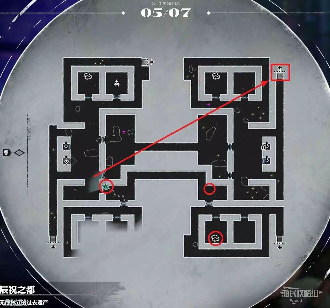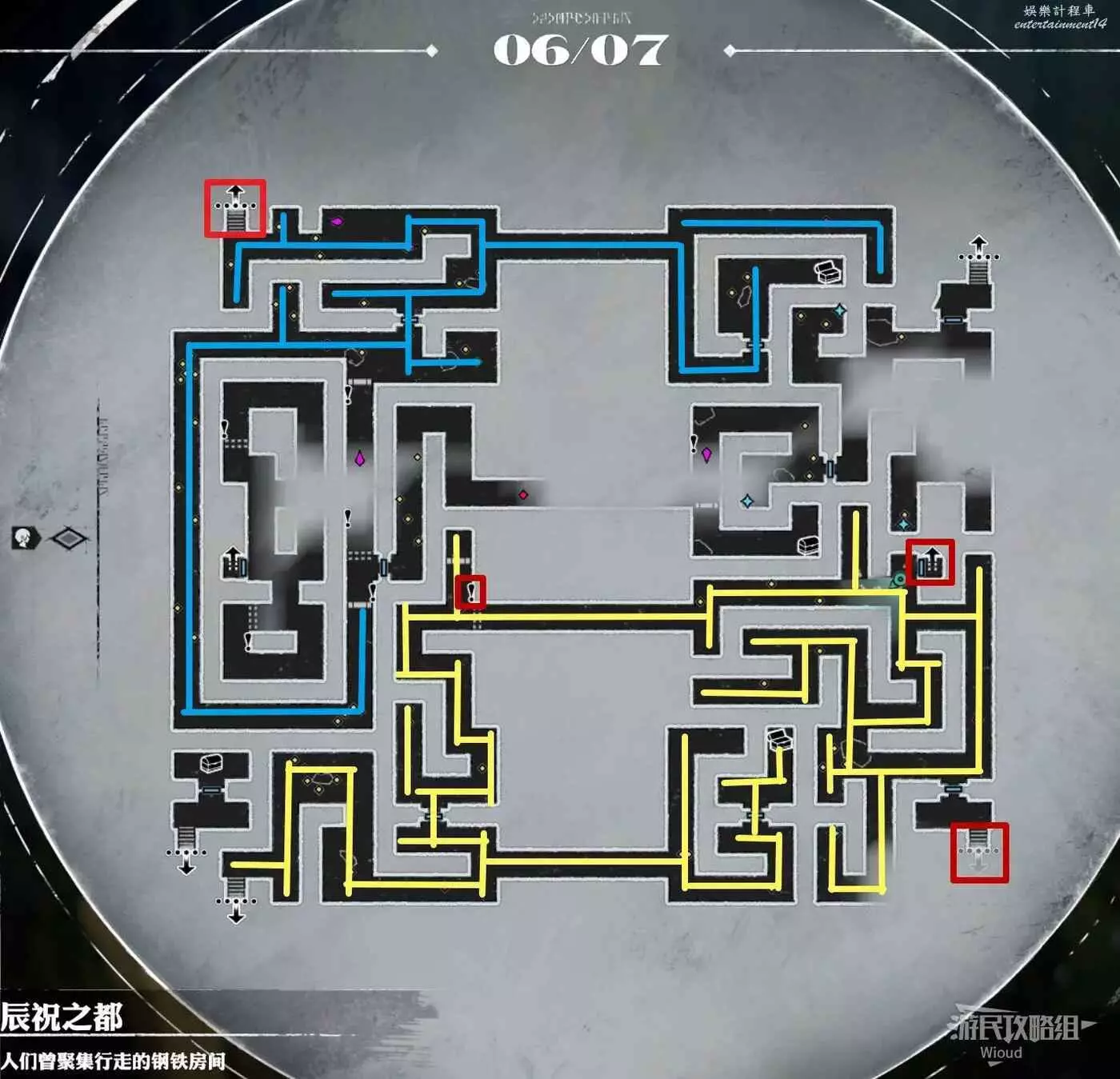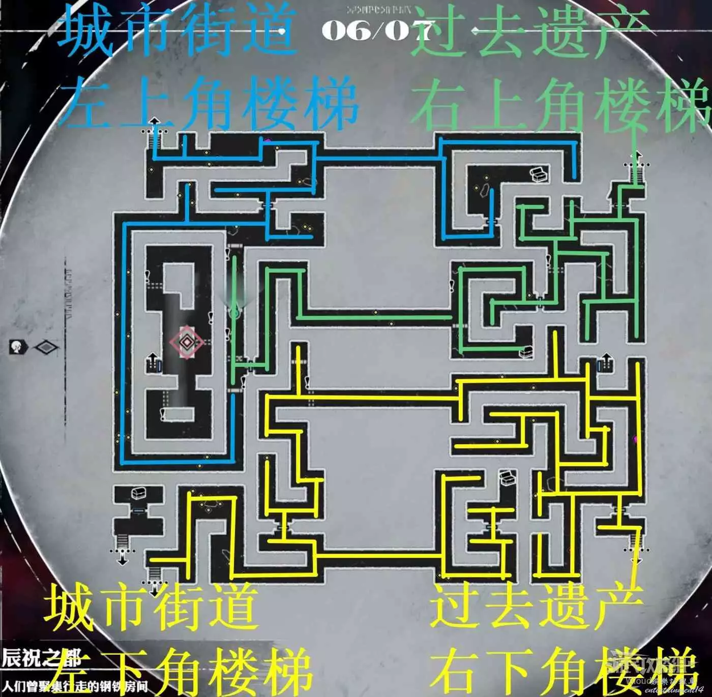 下半部分右上的電梯通往辰祝之都一層【過去遺產】右側的電梯,右下角樓梯通往辰祝之都一層【過去遺產】右下角還未探索的區域,探索完畢後直接往右下角的樓梯走。