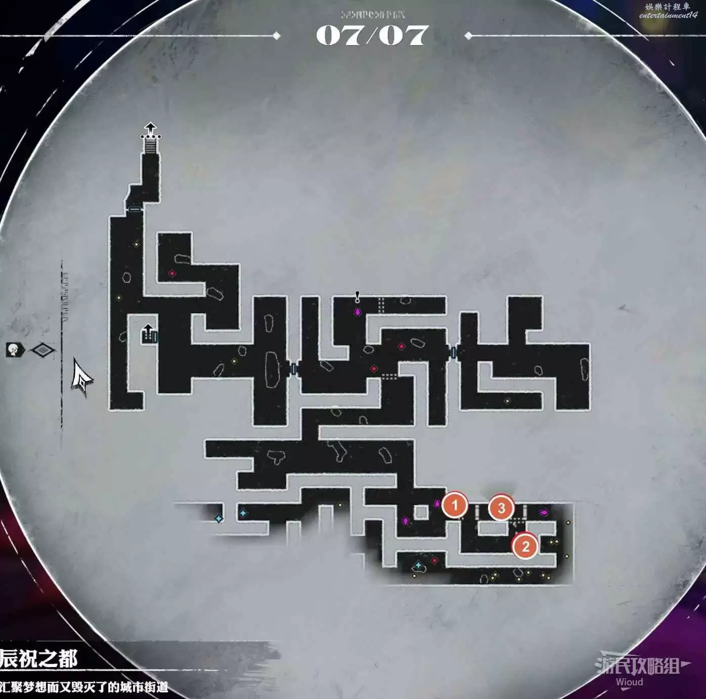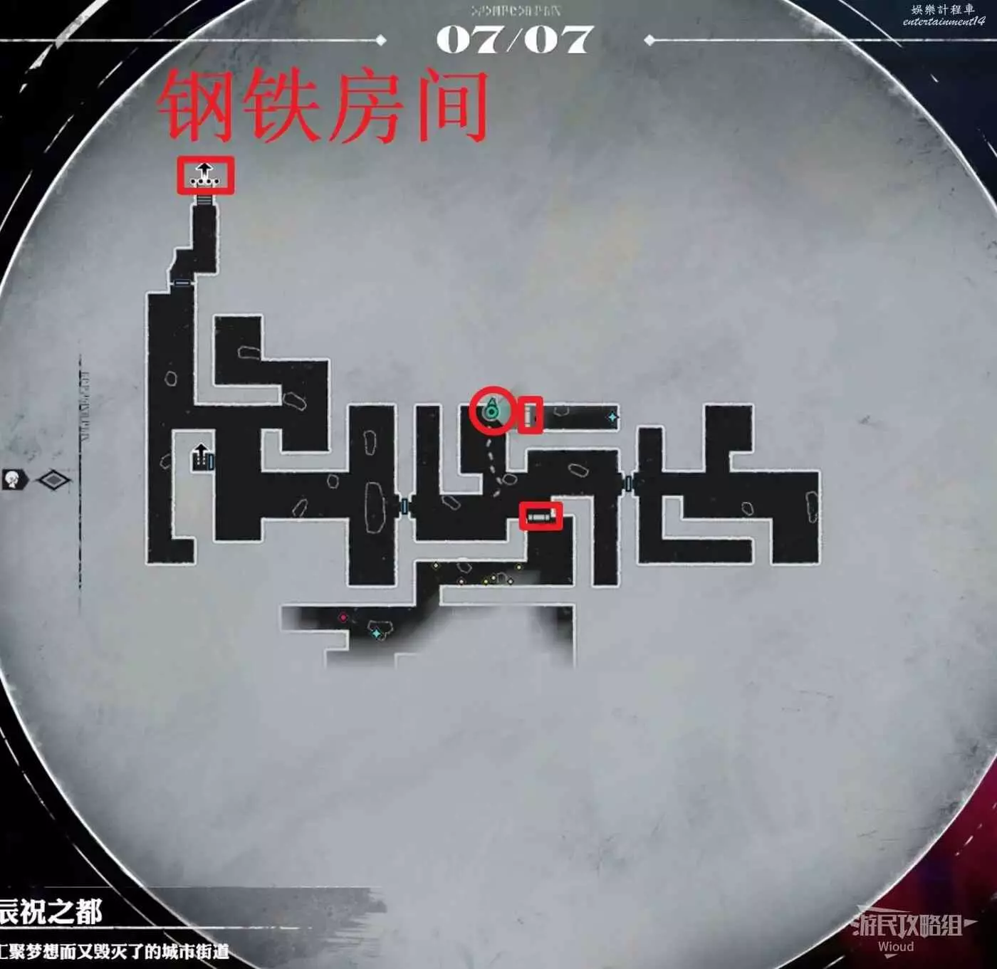 可以將【彙聚夢想而又毀滅了的城市街道】看作一個中間層,通過【城市街道】的兩個樓梯口可以探索【鋼鐵房間】兩塊地方。