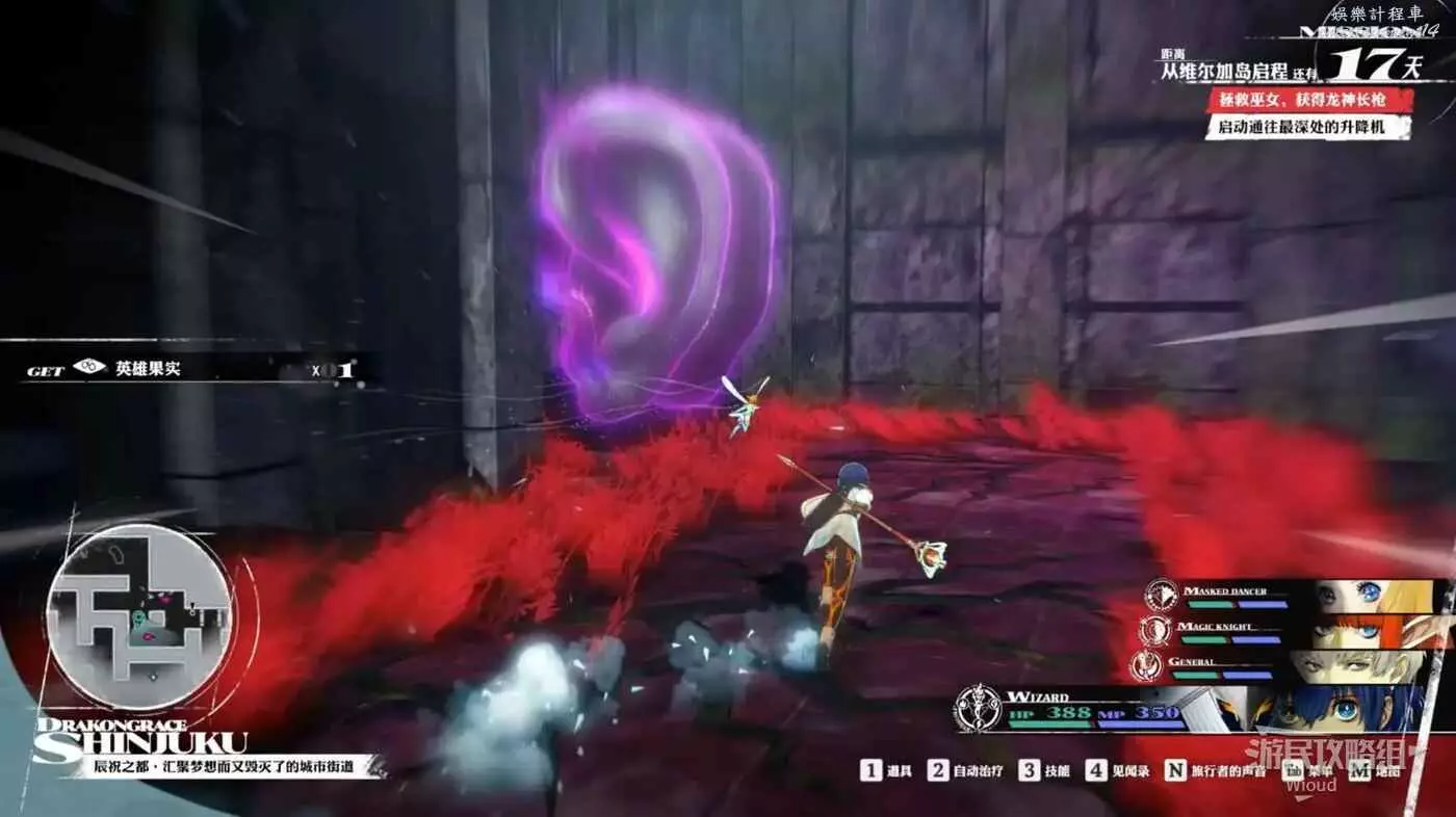 在下面走不了多遠就會遇到兩個紫色怪物不斷打轉的房間,控制角色走動,然後插到倆怪物的中間走到地圖右側的機關處。