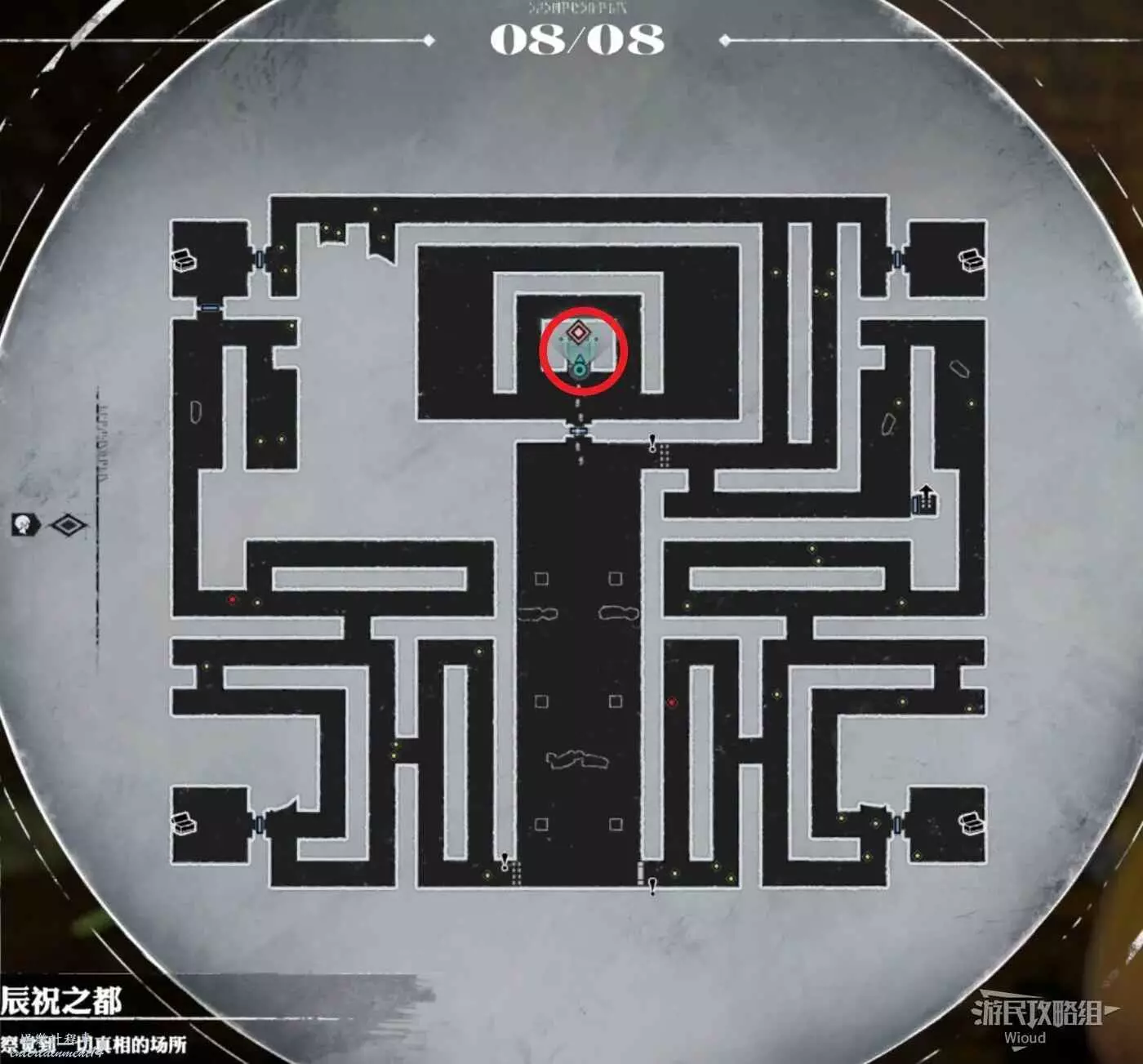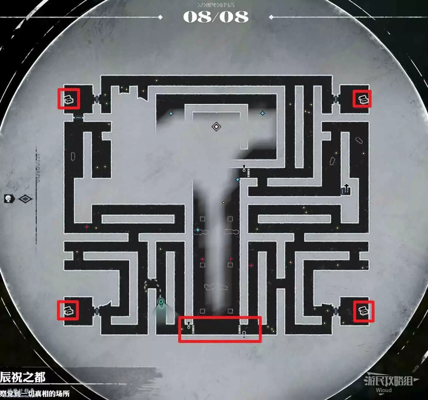 將入口右邊可以直接探索的區域走一遍,拿完所有藍點道具;與地圖中間黑色“!”處的機關互動,開啟機關右側與地圖下方的大門。