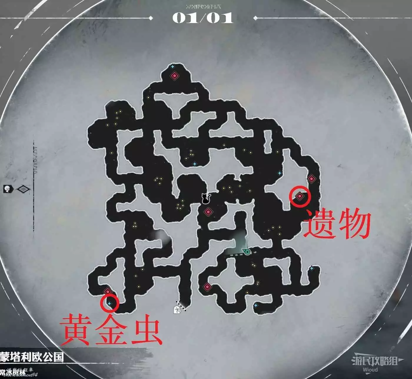進入森林先去地圖的左下角拾取【黃金蟲】,地圖右上角畫圈的指引點有一個寶箱,可以獲得此地圖的遺物。