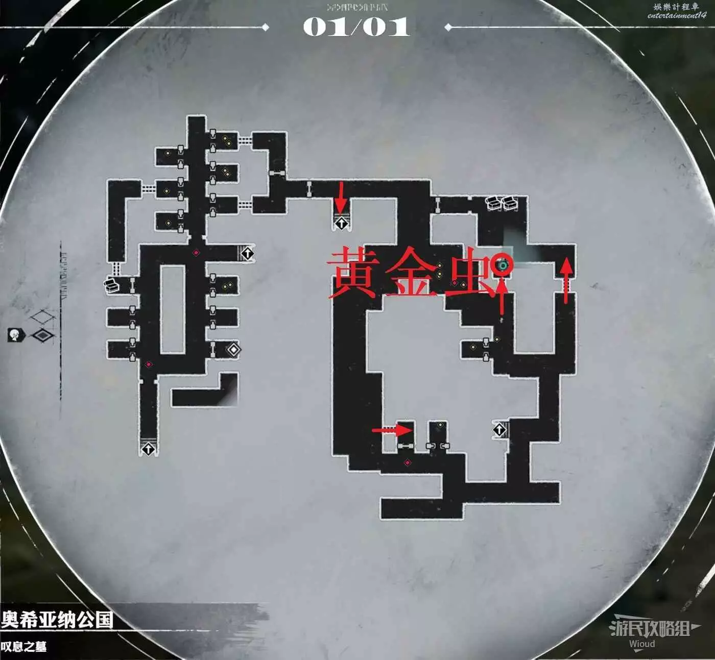 此處有三個狗洞通往不能直接走進去的房間,直接按照下圖的箭頭爬狗洞拿道具就行,中間畫圈的位置可以拿到一個黃金蟲。