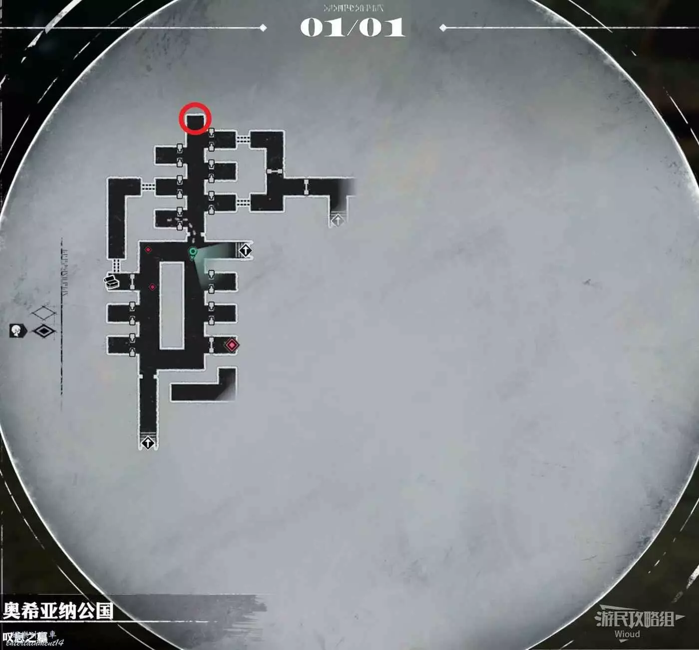 通過回字長方形走廊,左下角的房間可以爬狗洞拿中層左側封閉房間的道具,走到地圖中間區域與角落畫圈的機關互動可以開啟往下走的大門。