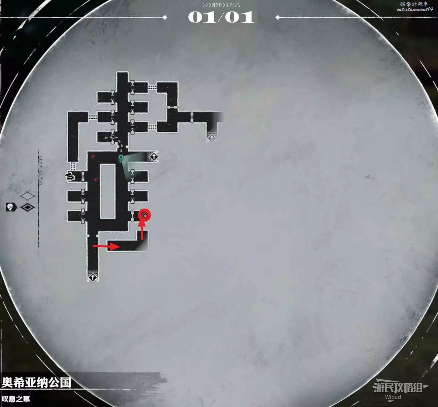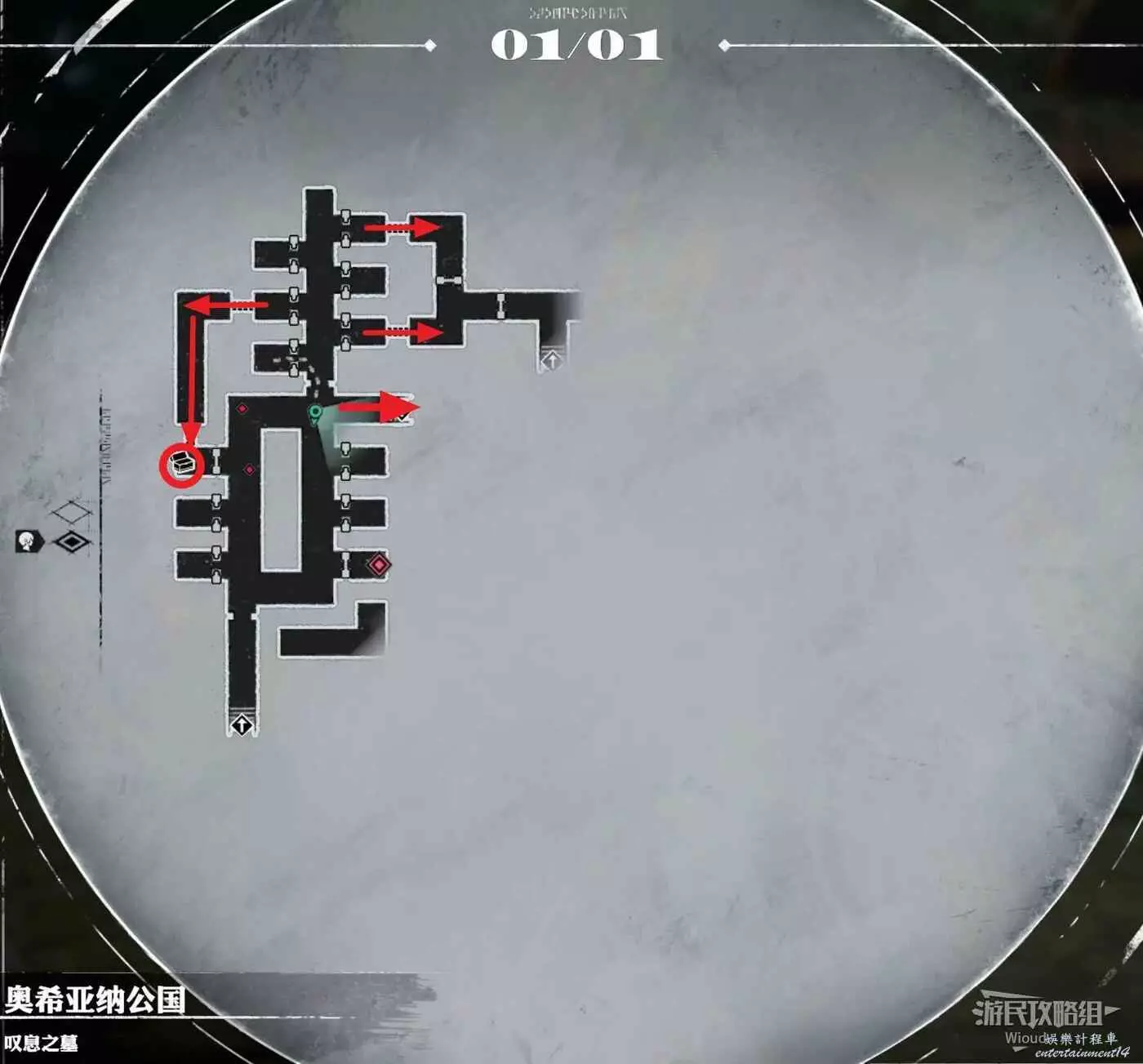 進入歎息之墓先將周圍可以直接拿的藍點道具全帶走,入口左側進不去的房間可以從左側區域走廊的狗洞鑽進去。