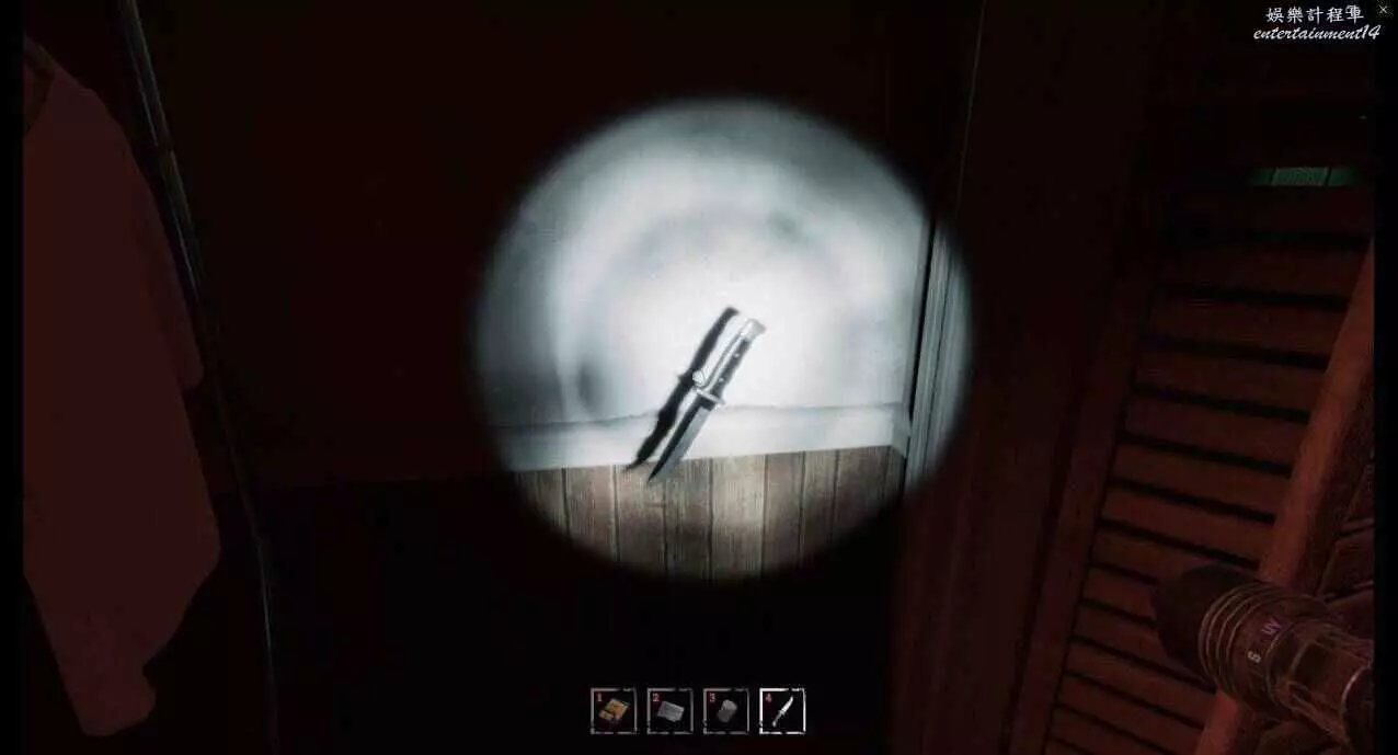 拿到保險絲後起身,向右轉,在右側牆壁上插著一把匕首,點擊互動拿取