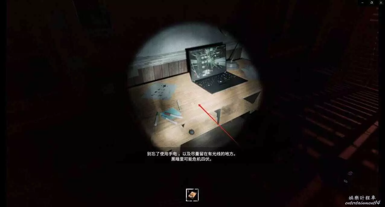 玩家拿起手電筒→燈熄滅,人體模型消失→出現關於使用手電筒的教學提示。