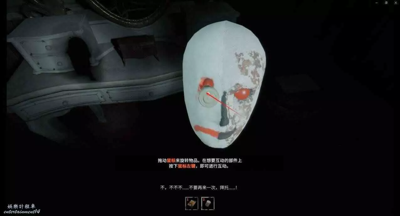 玩家繼續向前移動→又有一個人體模型擋住了前進的道路→側面會發現一個人體模型戴著小丑面具,鼻子不見了→玩家從背包裡拿出鼻子並給它戴上→能聽到笑聲→人體模型讓開道路→繼續往前走。