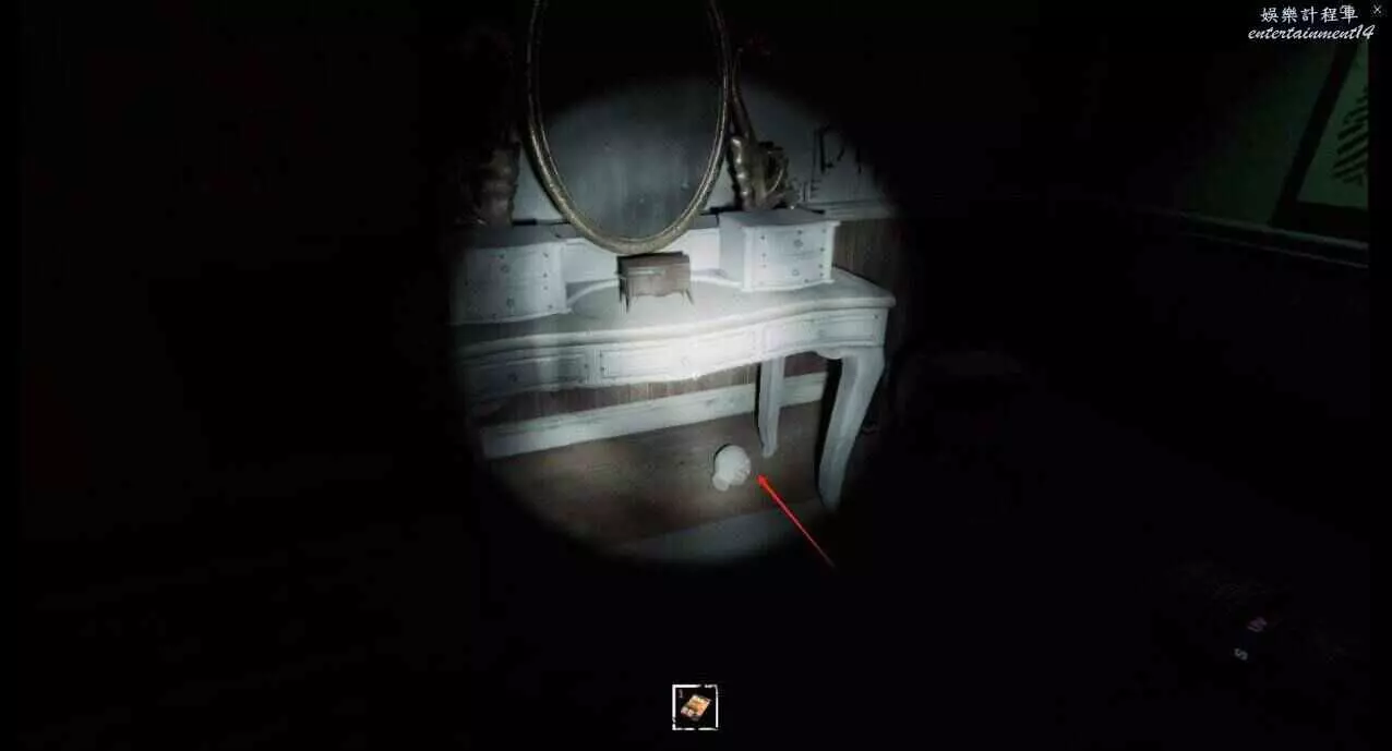 之後轉身來到化妝台前→找到桌子下的人體模型的頭→拿取保險絲