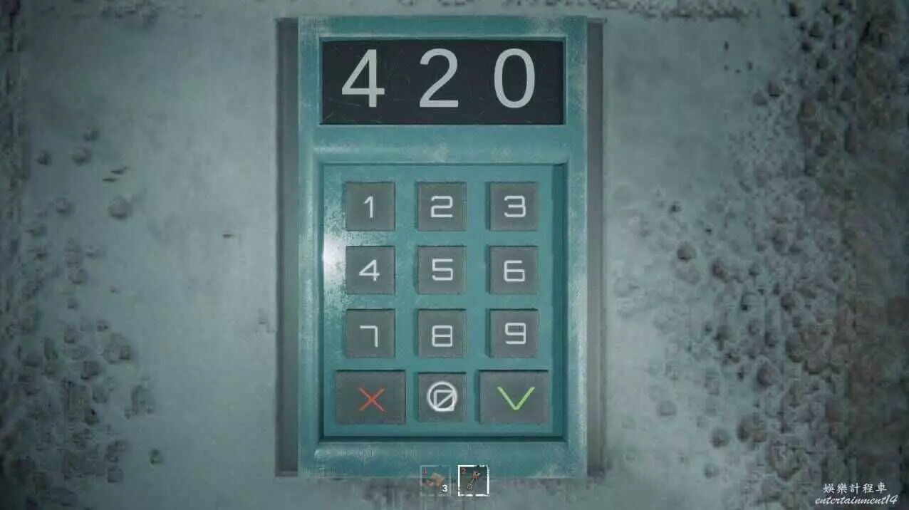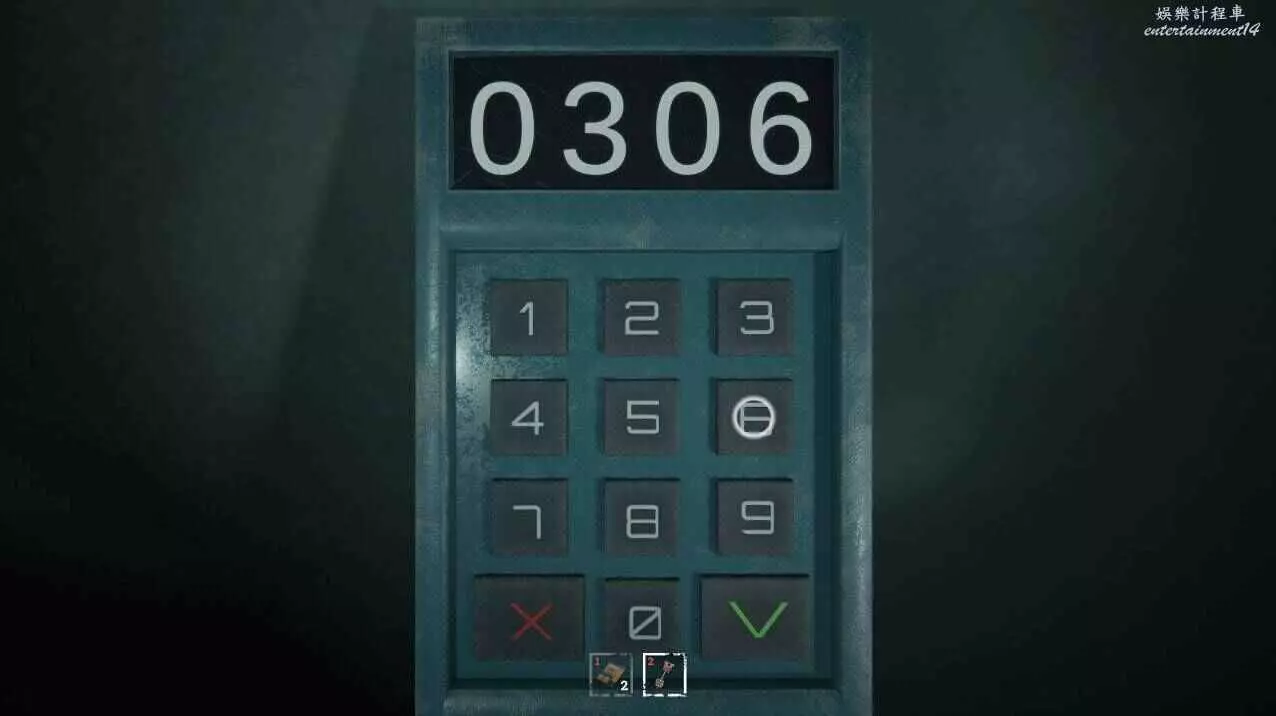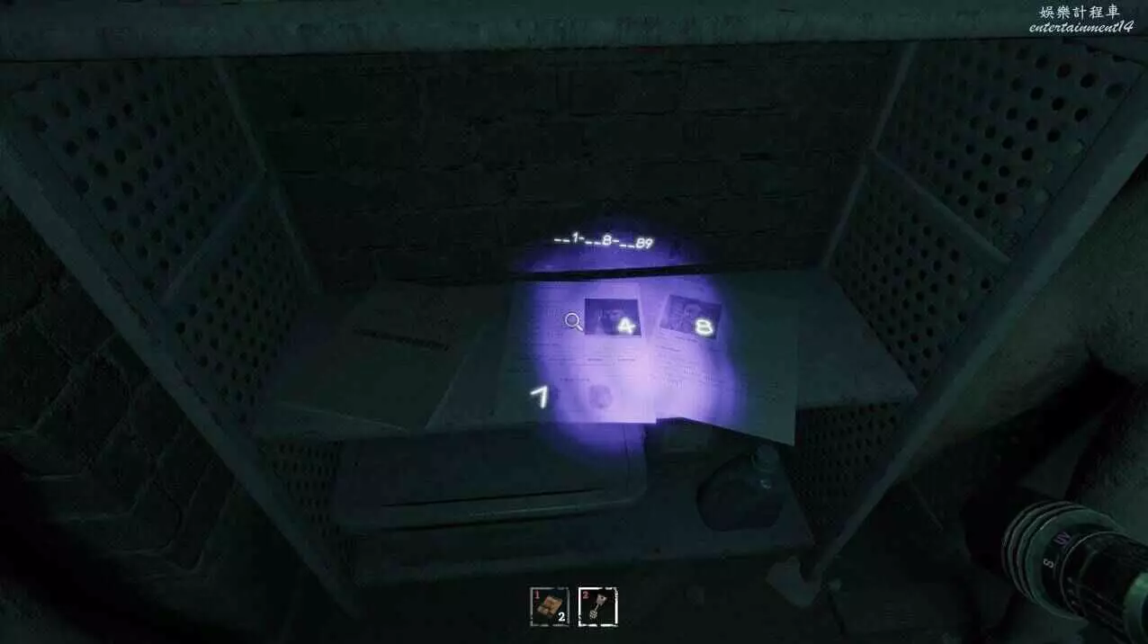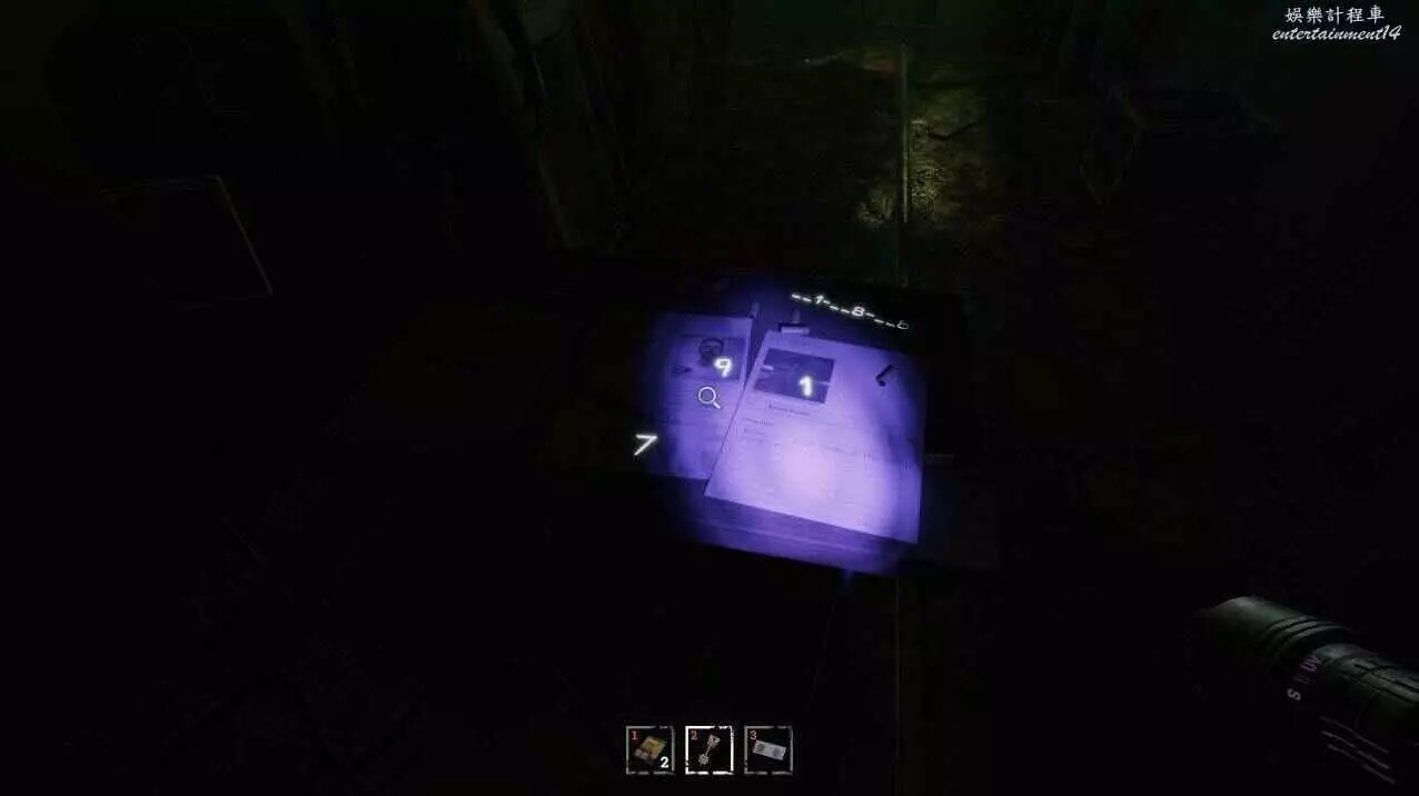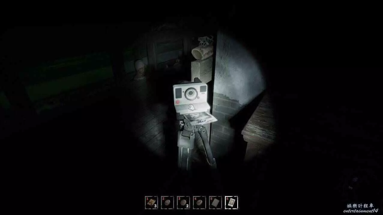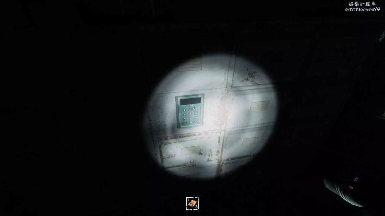 進入房間後,先拿右手邊的照相機,然後放到三角架上拍照,紫外線下可以得到照片的數位,然後左手邊的房間地面有數位,這樣子就找到了缺失的兩個數位,然後去輸入密碼