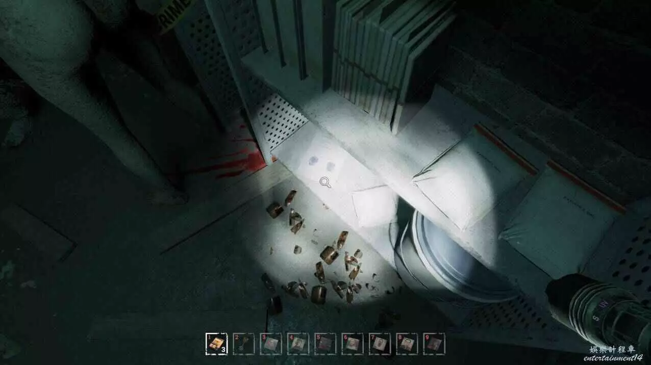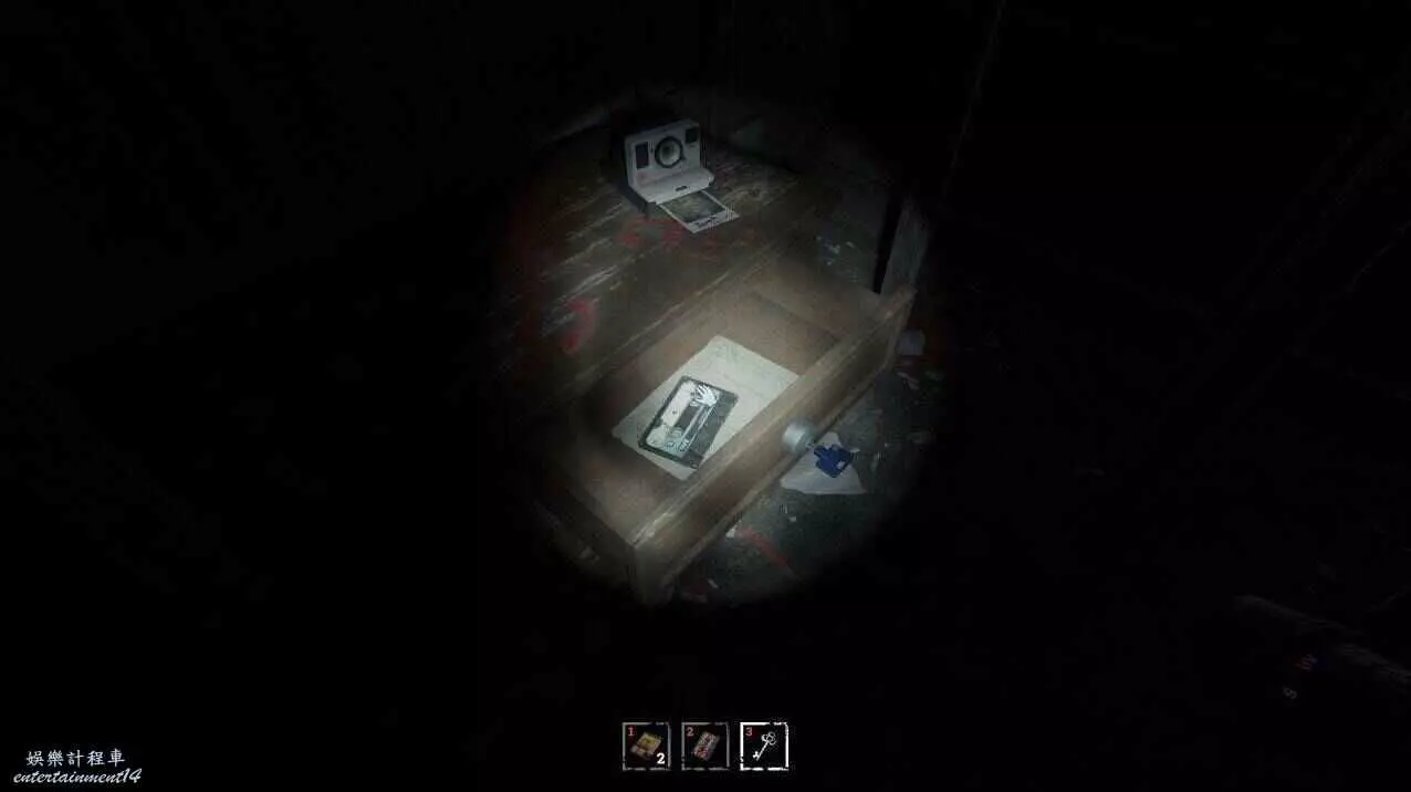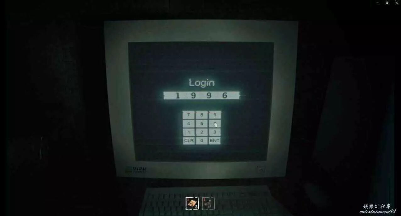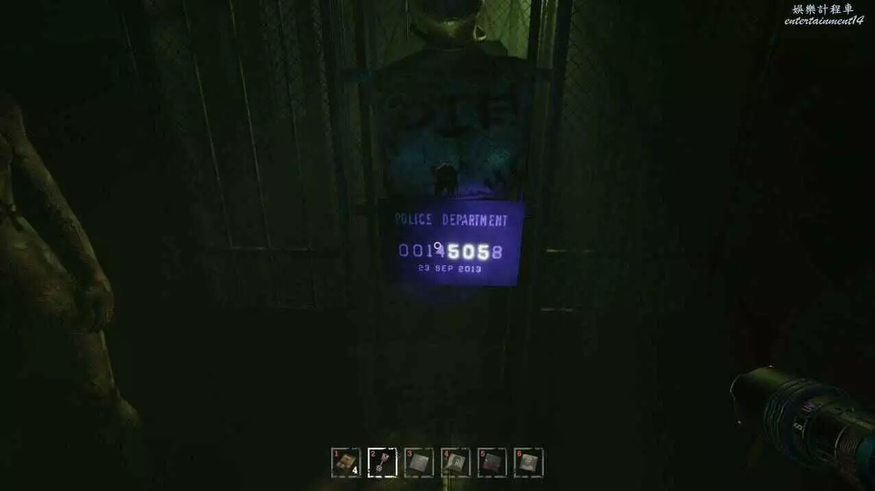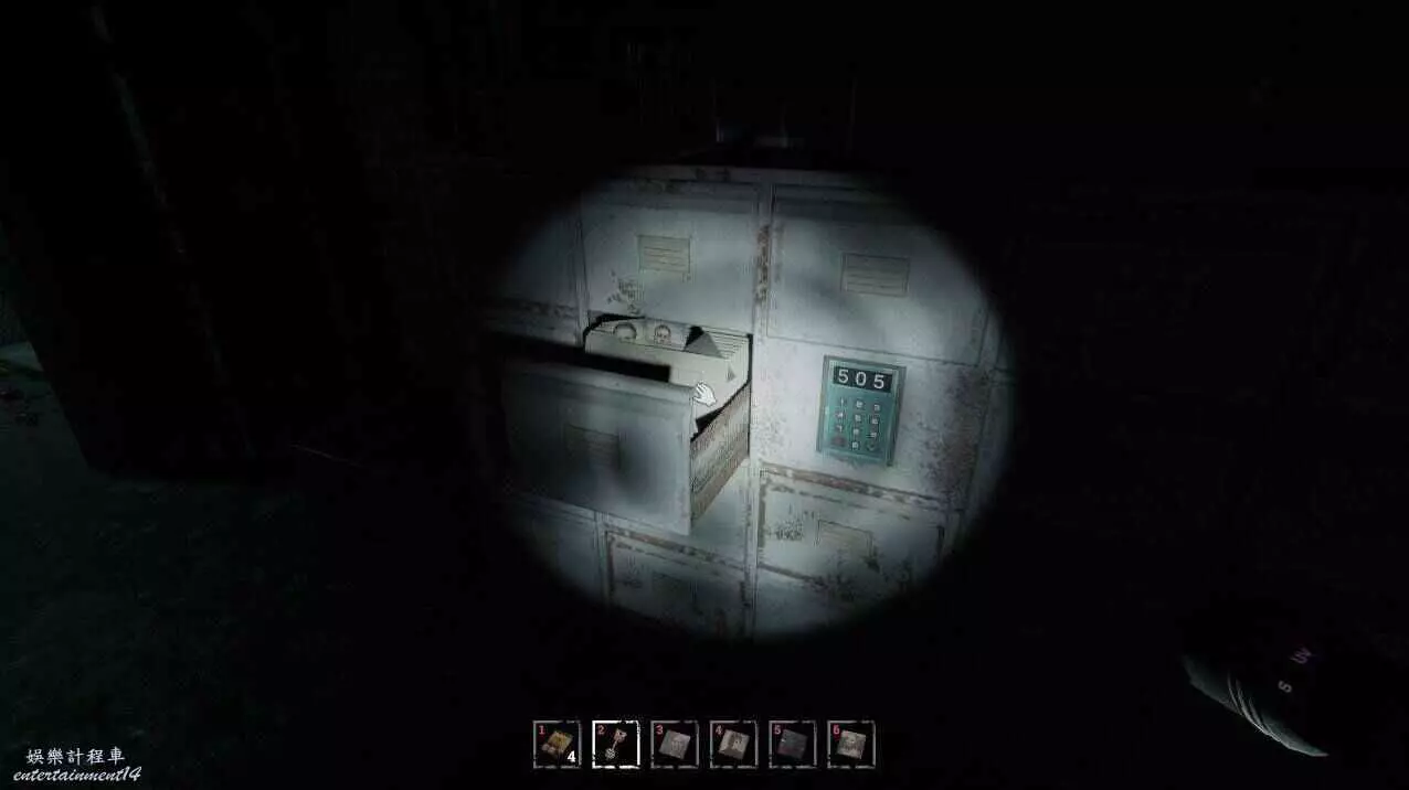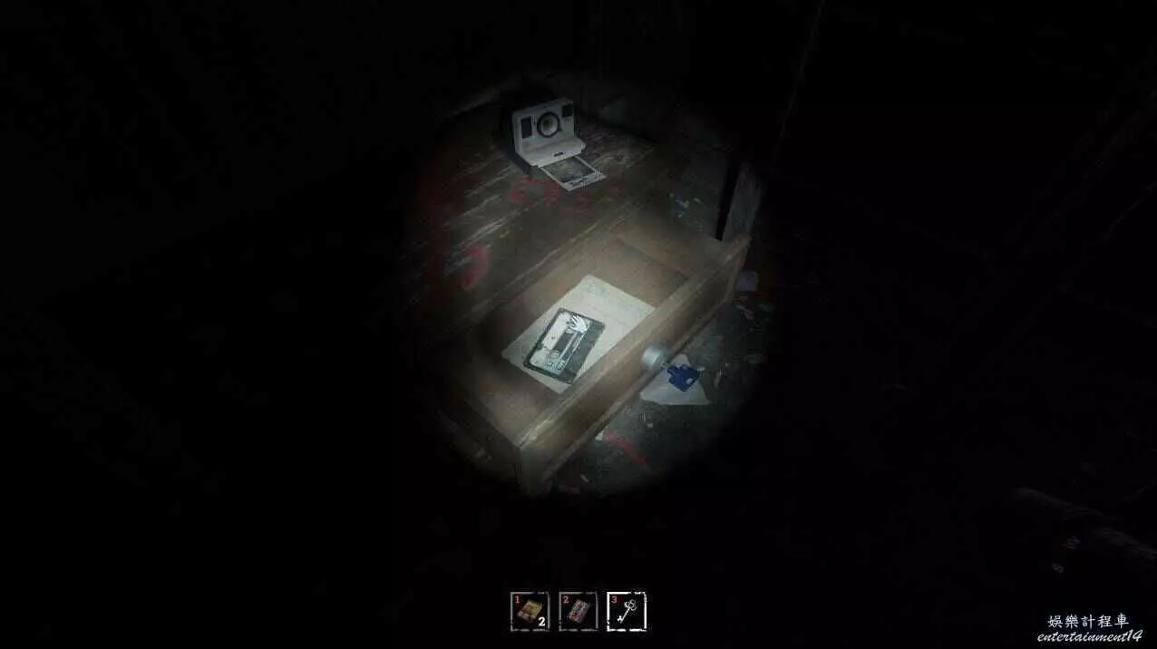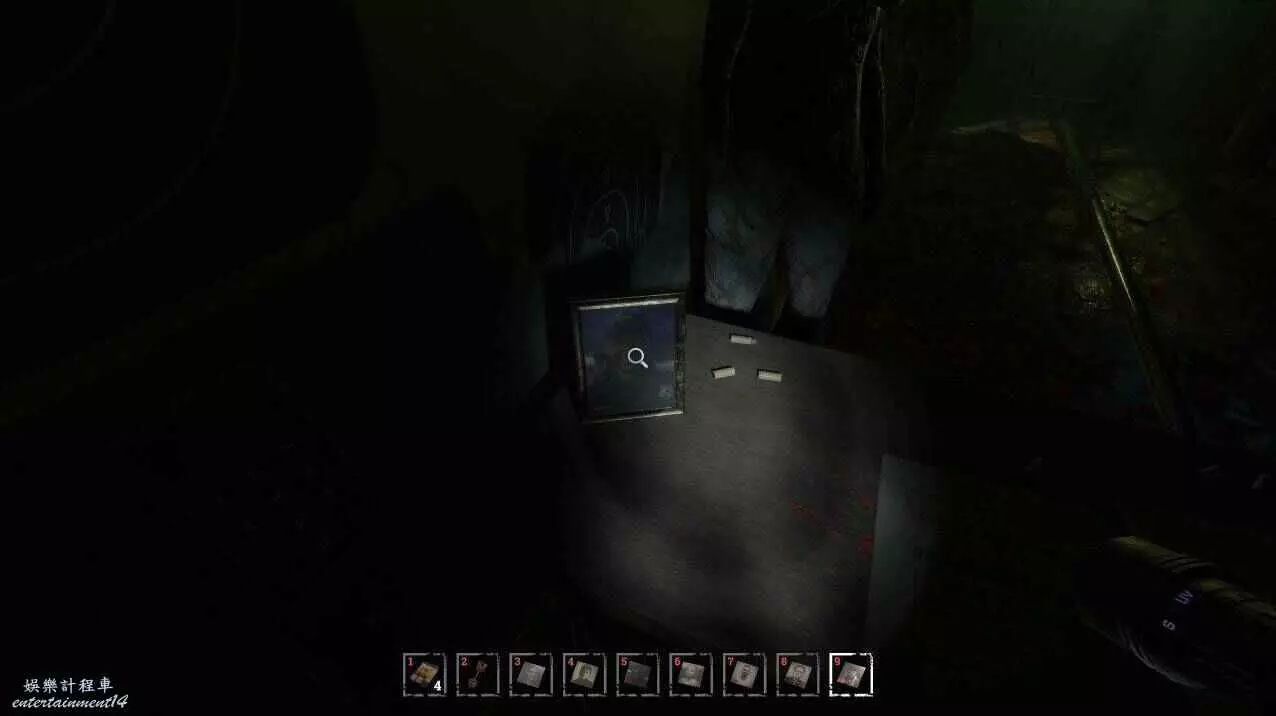 進入房間後,先拿右手邊的照相機,然後放到三角架上拍照,紫外線下可以得到照片的數位,然後左手邊的房間地面有數位,這樣子就找到了缺失的兩個數位,然後去輸入密碼