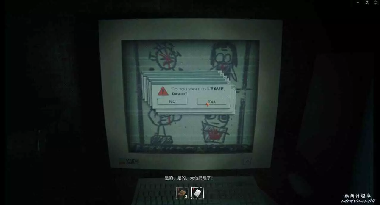 當兩張軟碟都插入後 → 會開始播放一組詭異的照片幻燈片 → 在幻燈片結束時,會出現一個黑色螢幕,上面寫著 “你想離開嗎,大衛?” → 下方有兩個按鈕,“是” 和 “否” → 當玩家試圖點擊 “是” 時,它會變成 “否” → 出口打開。