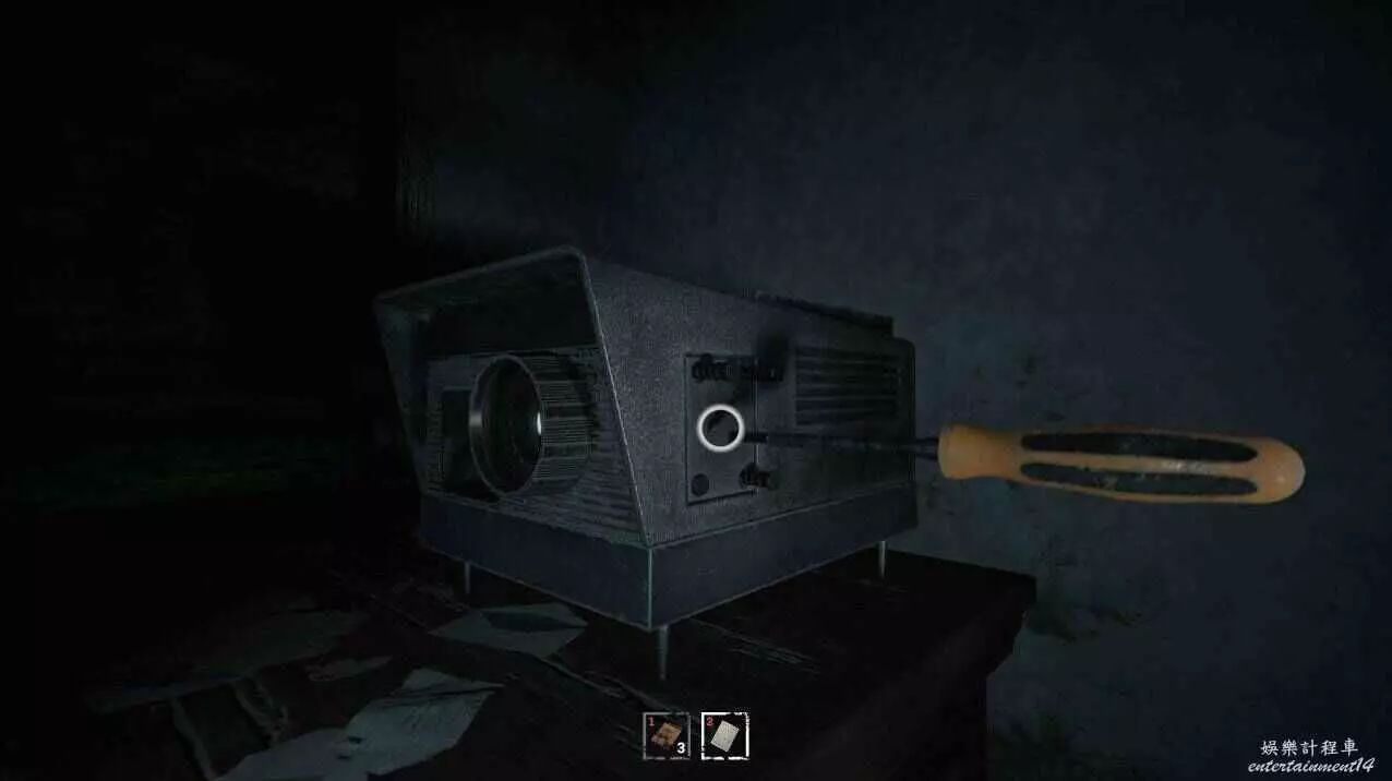 靠近投影儀啟動它後 → 與投影儀互動 → 觀看恐怖片段 → 看到鑰匙的影子從投影儀內部投射出來,遮住了調查板的線索。