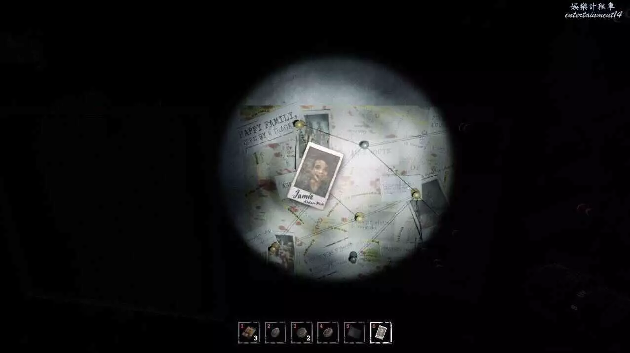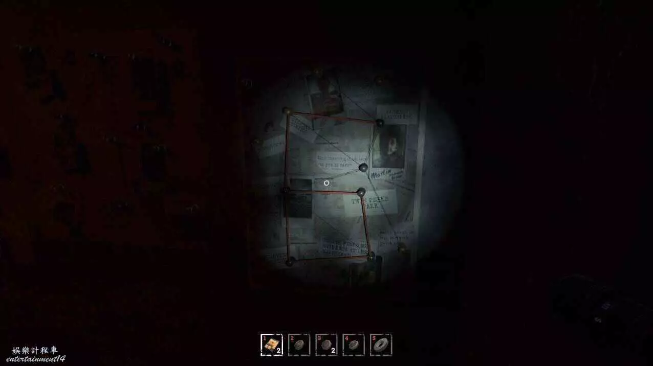 進入暗室後,檢查帶有別針固定照片和繩子的調查板,它被分成三個不同的部分 → 其中一個部分已經有主要的兒童照片;另外兩個部分需要用照片線索 I 和 II 來完成 – 我們需要把它們放在板子上才能開始處理這些內容。