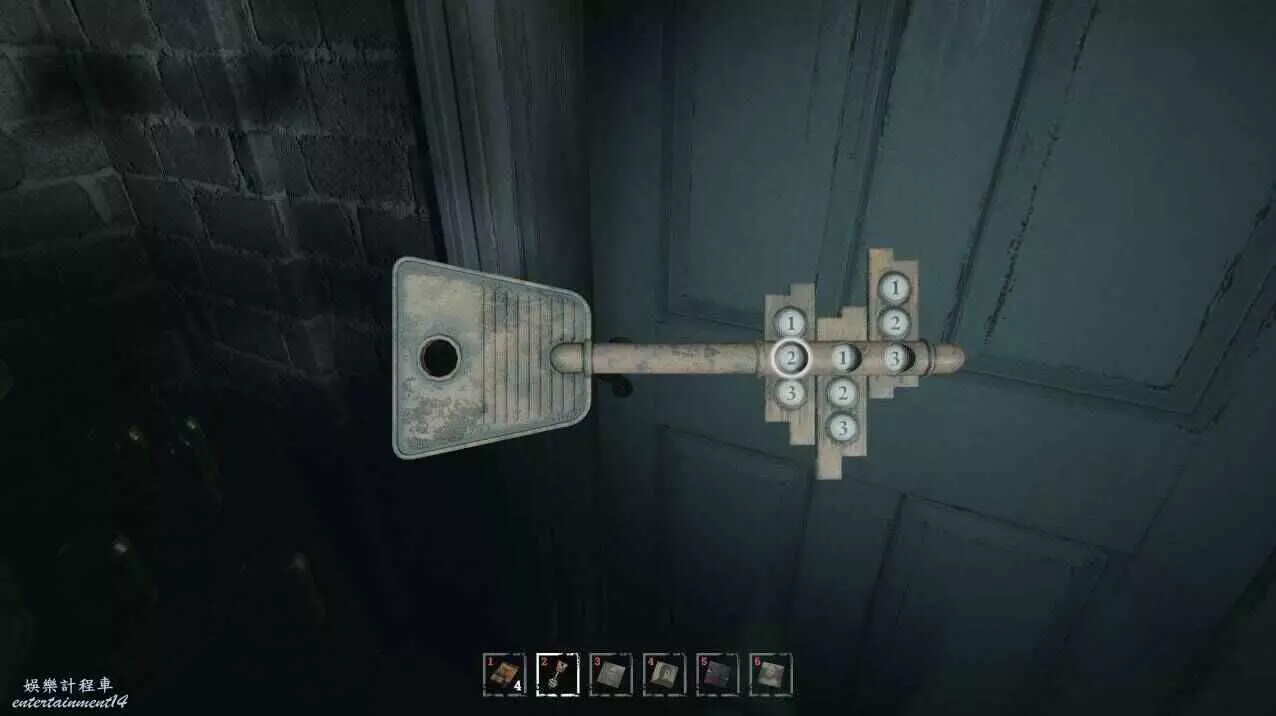 來到第五個房間後,先從左邊拿到頭,給右邊的人體模型安上,得到第一個數字,之後在書架上找到書和保險絲,與書互動得到第二個數字,之後來到浴室看牆上獲得第三個數字