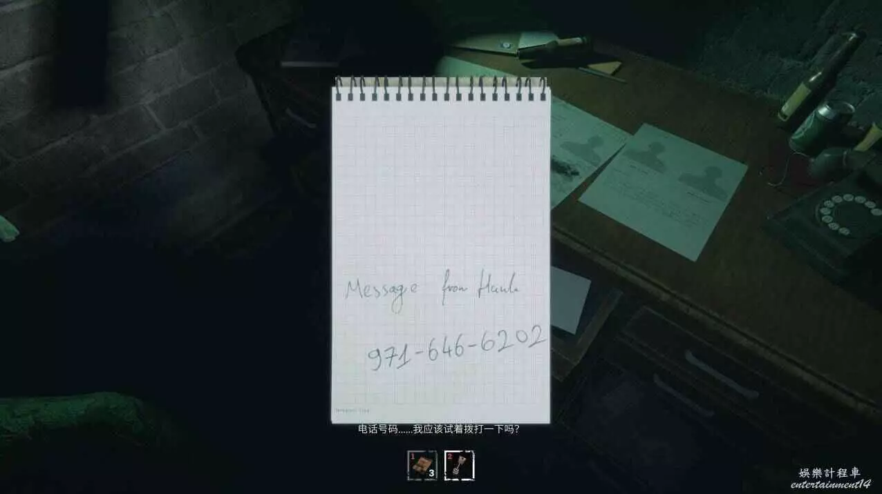 在書桌的其中一個抽屜裡找到鑰匙線索便條 1→根據線索將鑰匙設置到正確的狀態→用鑰匙打開大書桌抽屜→找到寫有 “來自漢克的消息” 以及一個電話號碼(971 – 646 – 6202)的記事本