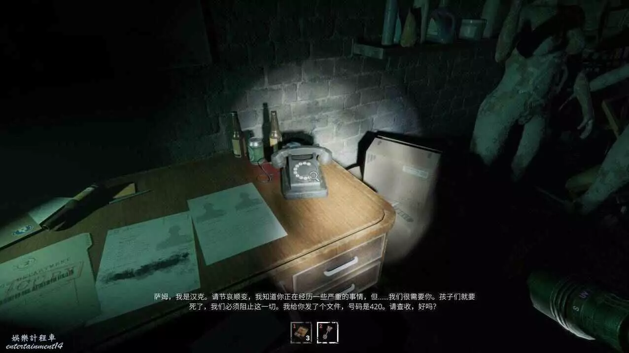 用電話撥打在記事本上找到的電話號碼→聽到漢克的消息,其中包含一個數位 “420”→在檔櫃中輸入數位 420→找到鑰匙線索便條 2 和兩張受害者照片(傑米和馬丁)→根據線索將鑰匙設置到正確的狀態→打開儲物間門