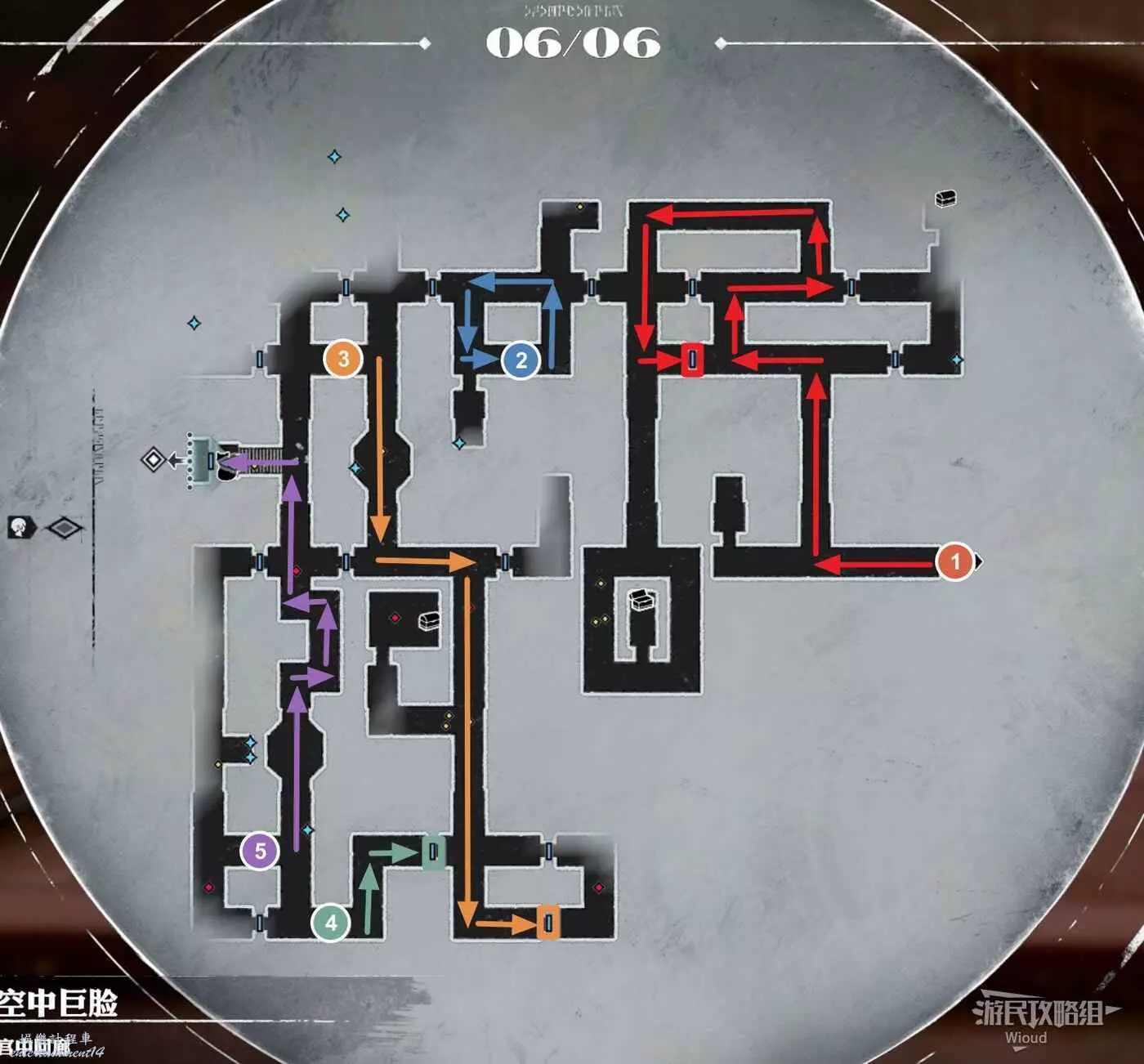 隨後從黃色編號3的位置出來,打開地圖下方黃框所示的門從左側綠色箭頭區域出現,繼續沿著路線走,從地圖左邊出現後直接進入BOSS房戰鬥。