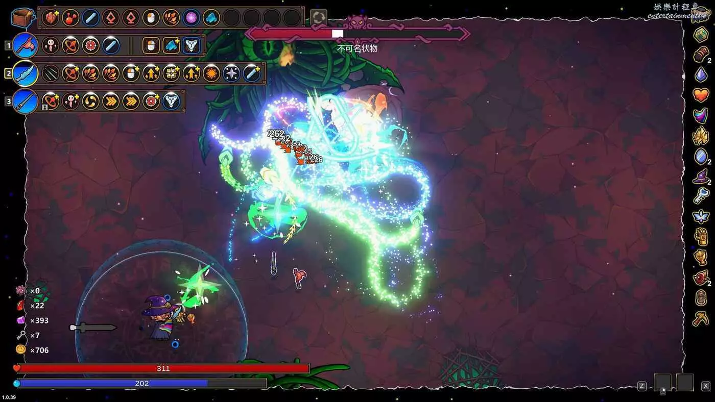 在資源豐富後,考慮引入多重散射進一步增加飛劍同時射出的數量,並且搭配各種增加傷害的遺物和法術強化進一步增加飛劍的傷害。特別注意的是,此時的多重散射可以考慮不進行合成,因為比起其各種屬性的提升,這裡更需要它最基本的增加同時出射的能力來把飛劍射出去。此外,還可以考慮引入持續時間增長等屬性,通過延長尋路效果來進一步增加傷害。
