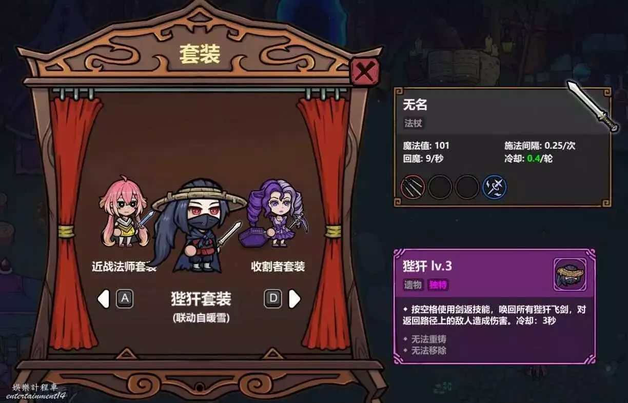 聯動自背包亂鬥的收割者套裝,初始法杖變成了死神鐮刀,攜帶冥蛇和毒液,遺物可以讓中毒層數*3,每次進門還能自動合成背包中的法術。這個自動合成功能簡直是神來之筆,省去了集齊3個同類法術卻總是刷不到商店的煩惱,不愧是背包亂鬥的聯動。