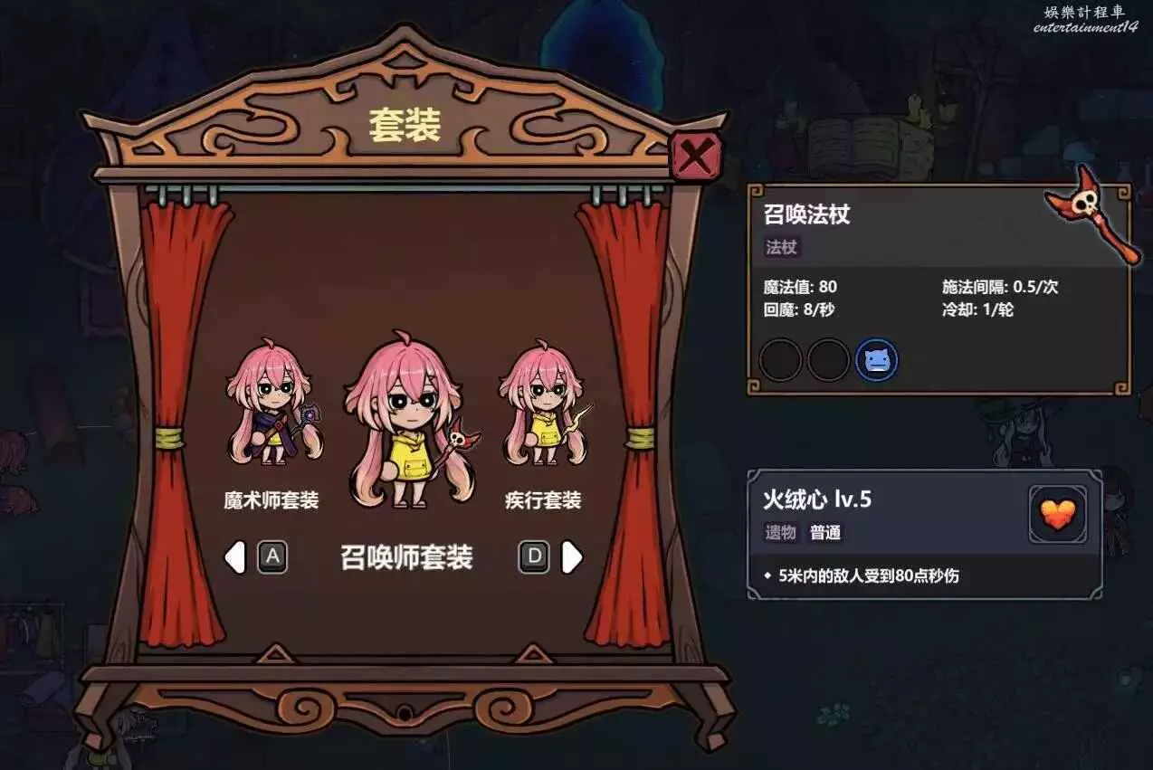 遊戲自帶的召喚師套裝,除了開局自帶召喚法杖和召喚法術,遺物可以升級,最高升到lv5的火絨心,可以在5米範圍內對敵人造成80點每秒傷害。這個5米的範圍很大,前幾關基本都不需要去刷法術,可以按照自己的養成路線刷金幣或者遺物。