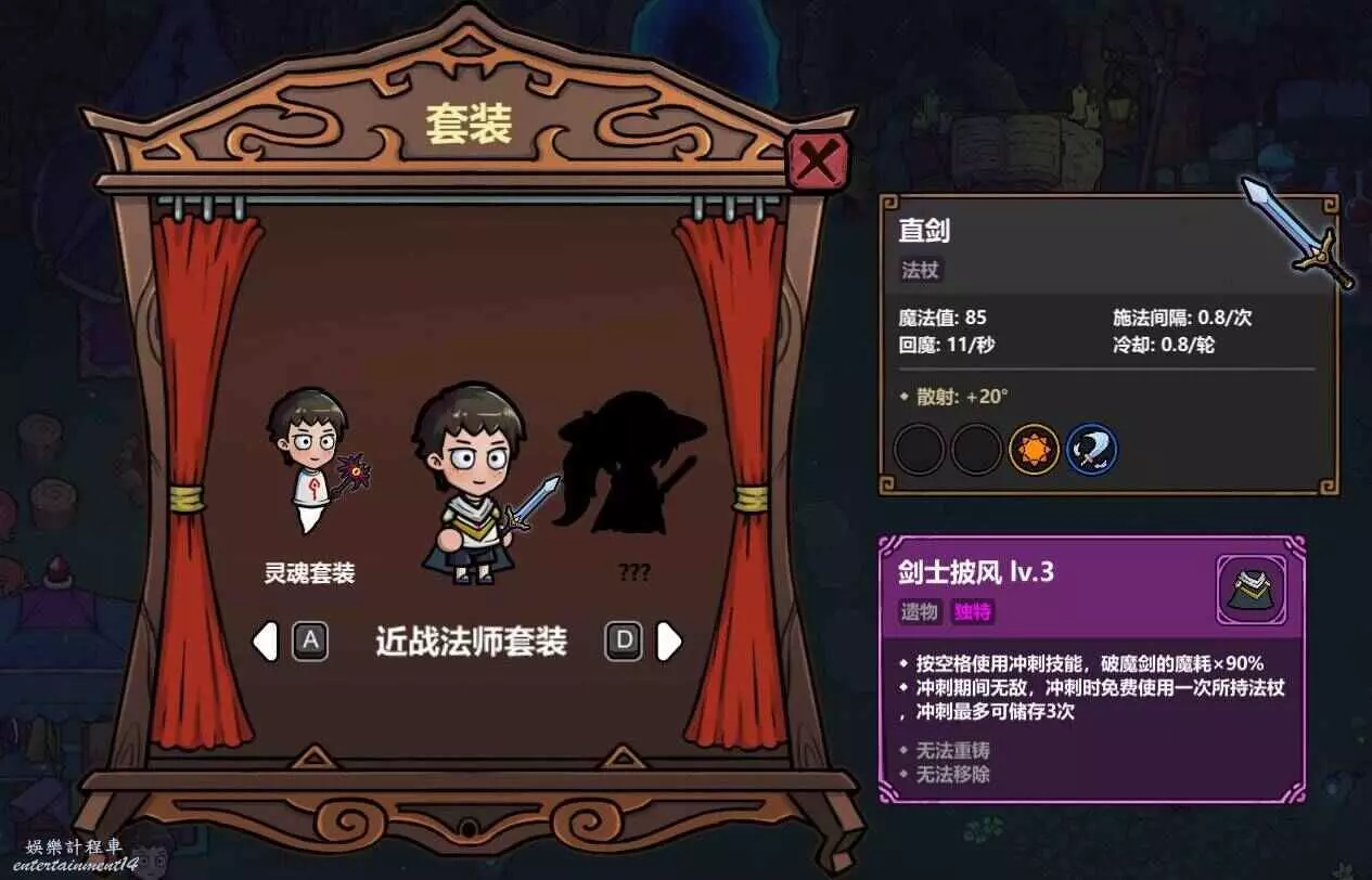 近戰法師套裝的設定也很有想法,自帶直劍、破魔劍法術和法術範圍增大,主動技能更是可以衝刺到敵人面前釋放一次法杖法術。選擇施法間隔和冷卻時間短的法杖,並搭配同時施法,可以打出衝刺至敵人面前並揮劍秒殺敵人的爽快戰鬥效果。