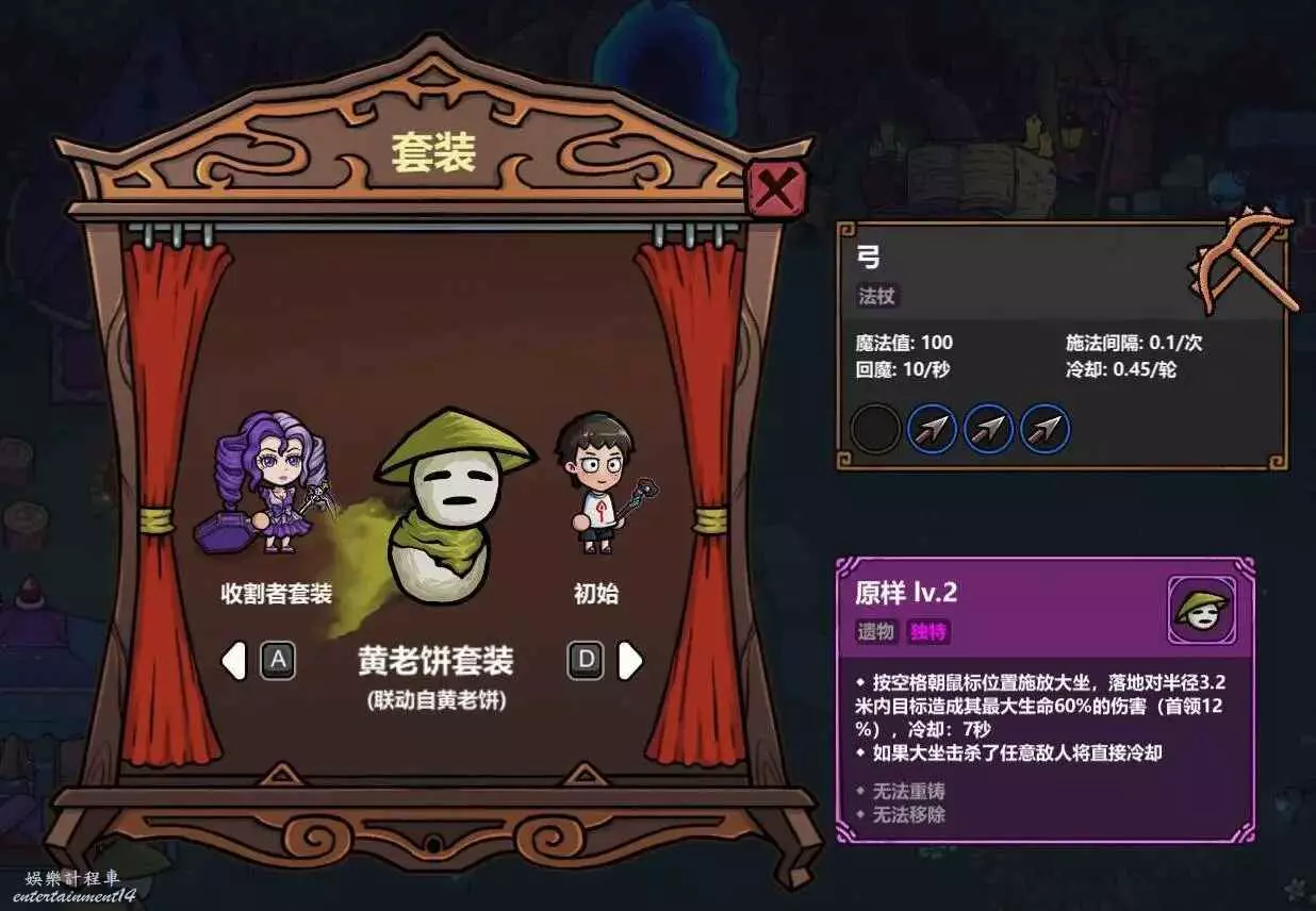 聯動自黃老餅的套裝,初始法杖變成了弓,法術是黃老餅的箭頭(釋放50次,下次變成4個大箭頭),主動技能是黃老餅的招牌大坐,對小怪造成60%的傷害,首領12%的範圍傷害,冷卻時間7秒,兼顧了強度和娛樂性。