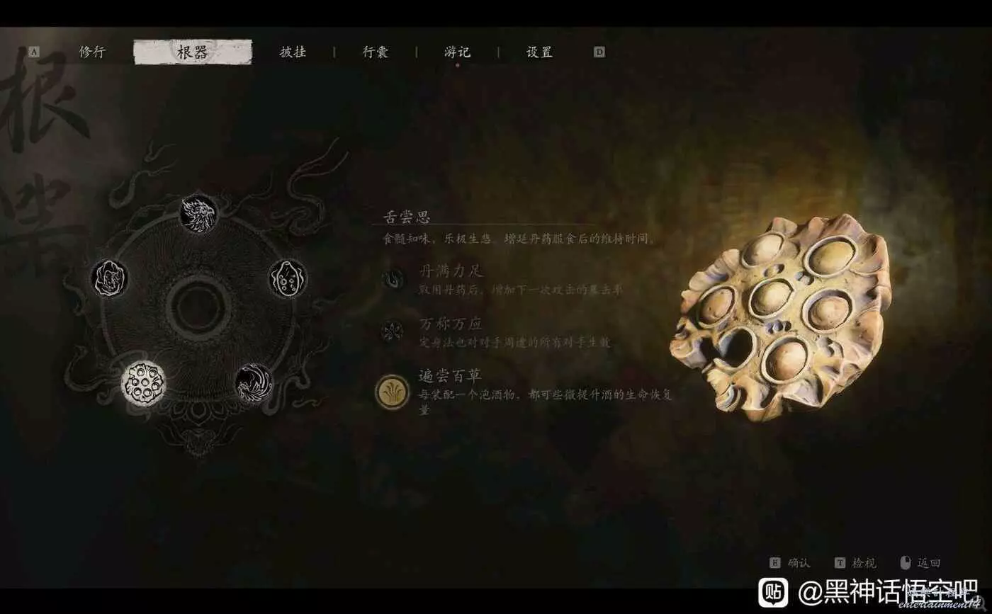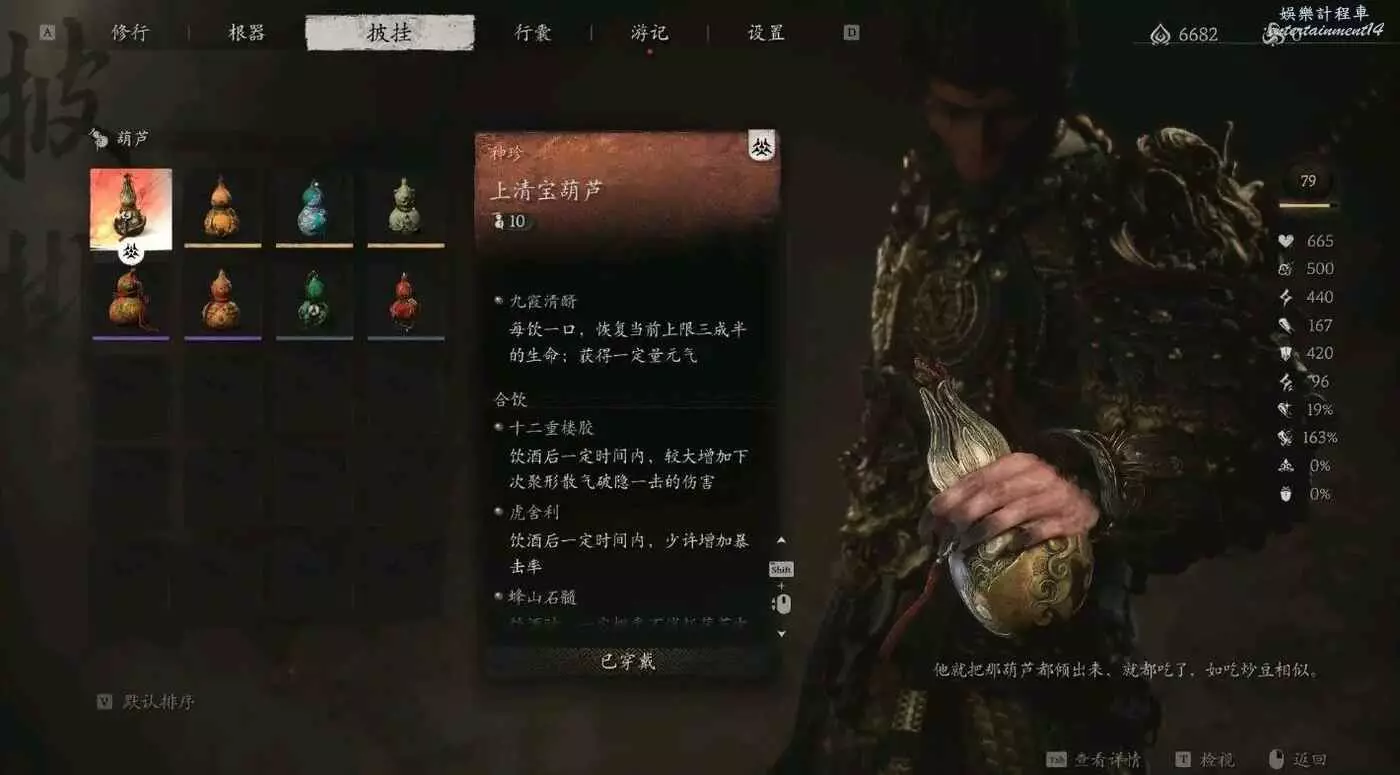 葫蘆就用上清葫蘆,量大管飽,酒帶九霞青醑回元氣使用芭蕉扇,泡酒物帶十二重加破隱一擊傷害,剩下倆其實無所謂,我帶了虎舍利加點輸出,順便帶個峰山石髓碰碰運氣