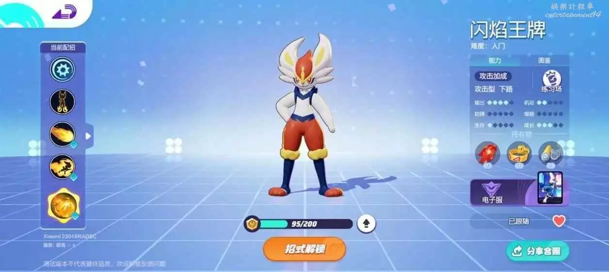 這次介紹的就是閃焰王牌,在大集結中,閃焰王牌為攻擊型(攻擊加成)寶可夢,突出點為輸出和機動,分路為下路!