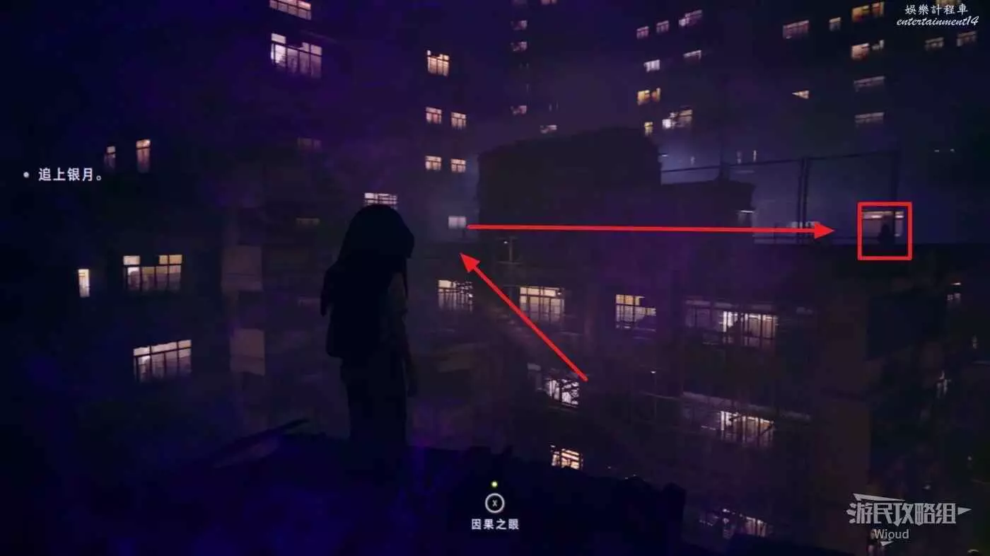 直接回到主幹道跳燈牌,肥龍面家右邊樓頂是神秘老太太的位置,新地館飯店燈牌左邊樓頂有一個記憶碎片,拿完這個記憶碎片往右邊的樓頂走,銀月就在這個記憶碎片右邊的樓頂。