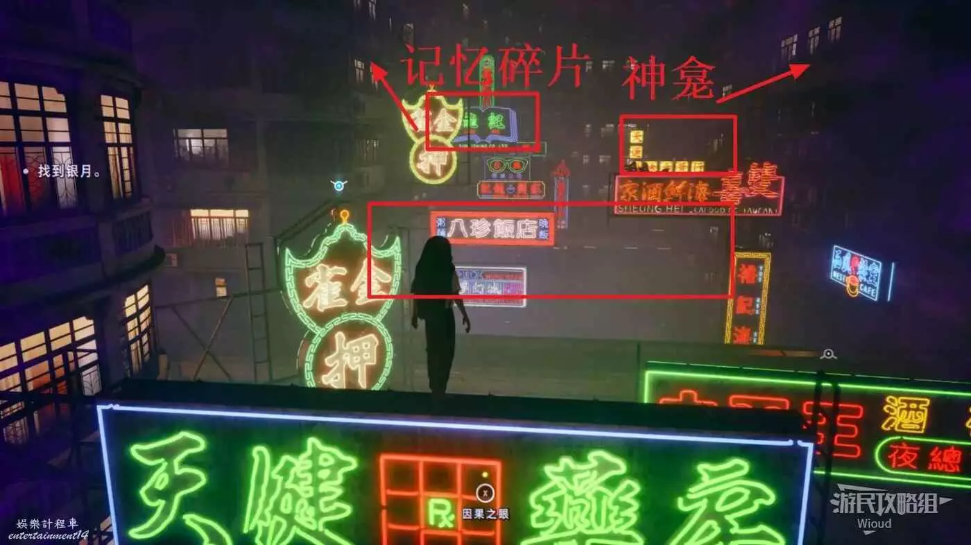 龍記燈牌左邊的樓頂可以拿一個記憶碎片(後面劇情必過可以先放著),右邊黃色的天運……燈牌右邊樓頂是一開始看到的神龕(需要單獨過去拿)。