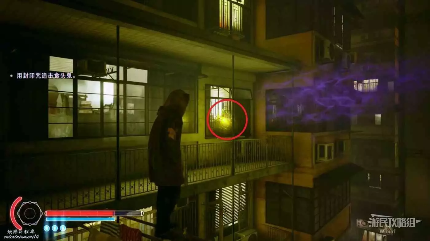 不要走動,在屍體的位置往左邊高處看,可以看到一個記憶碎片,先跳到最高處的晾衣架,再附身陽台上的NPC即可拿到。