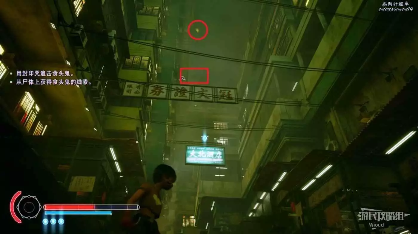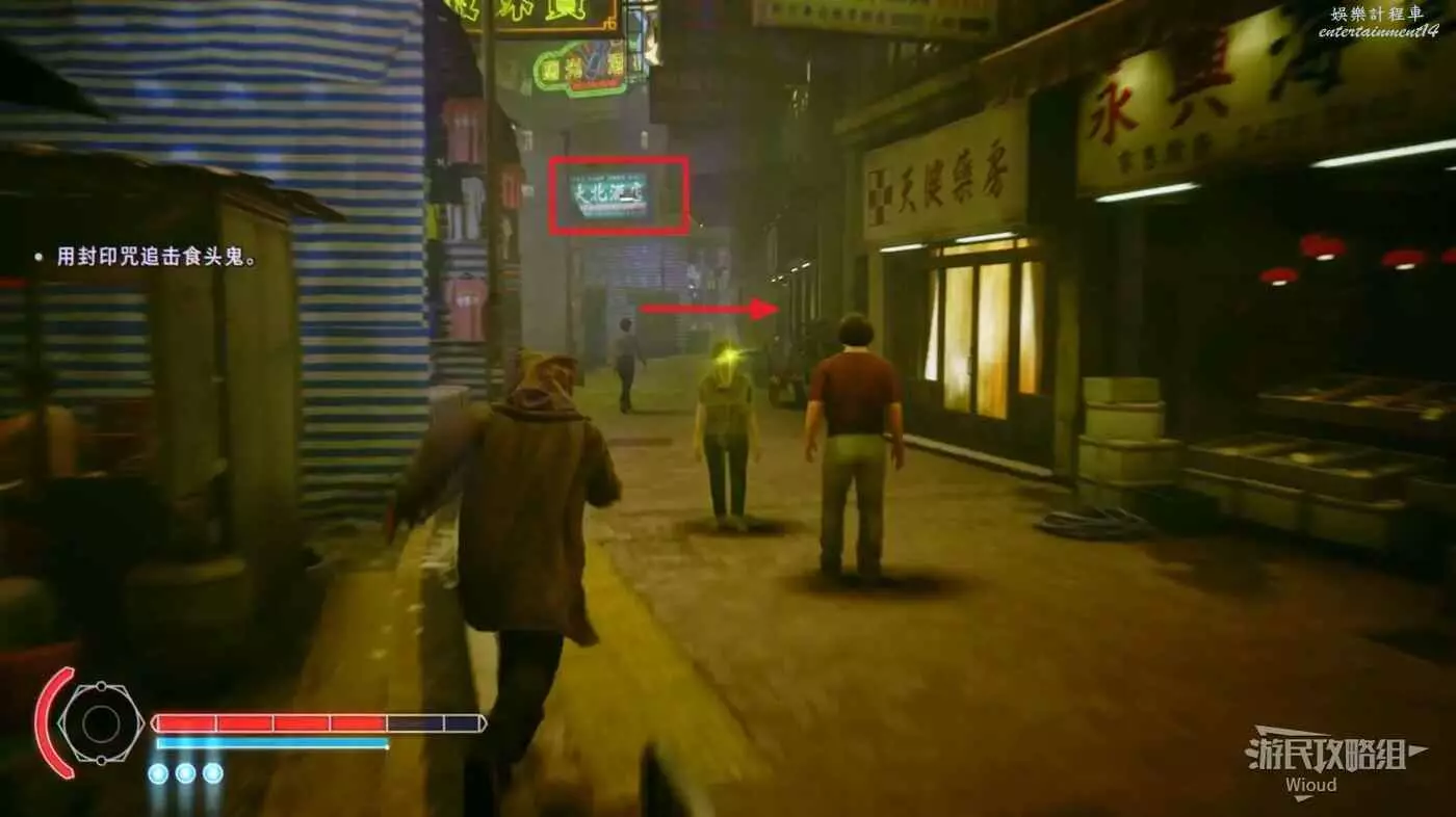 先不要著急上去打,回到下方屍體位置,先直走再左轉進入市場,沿著右邊的人行道走,前方綠色酒店燈牌右轉,進入往夜總會走的那條小道。