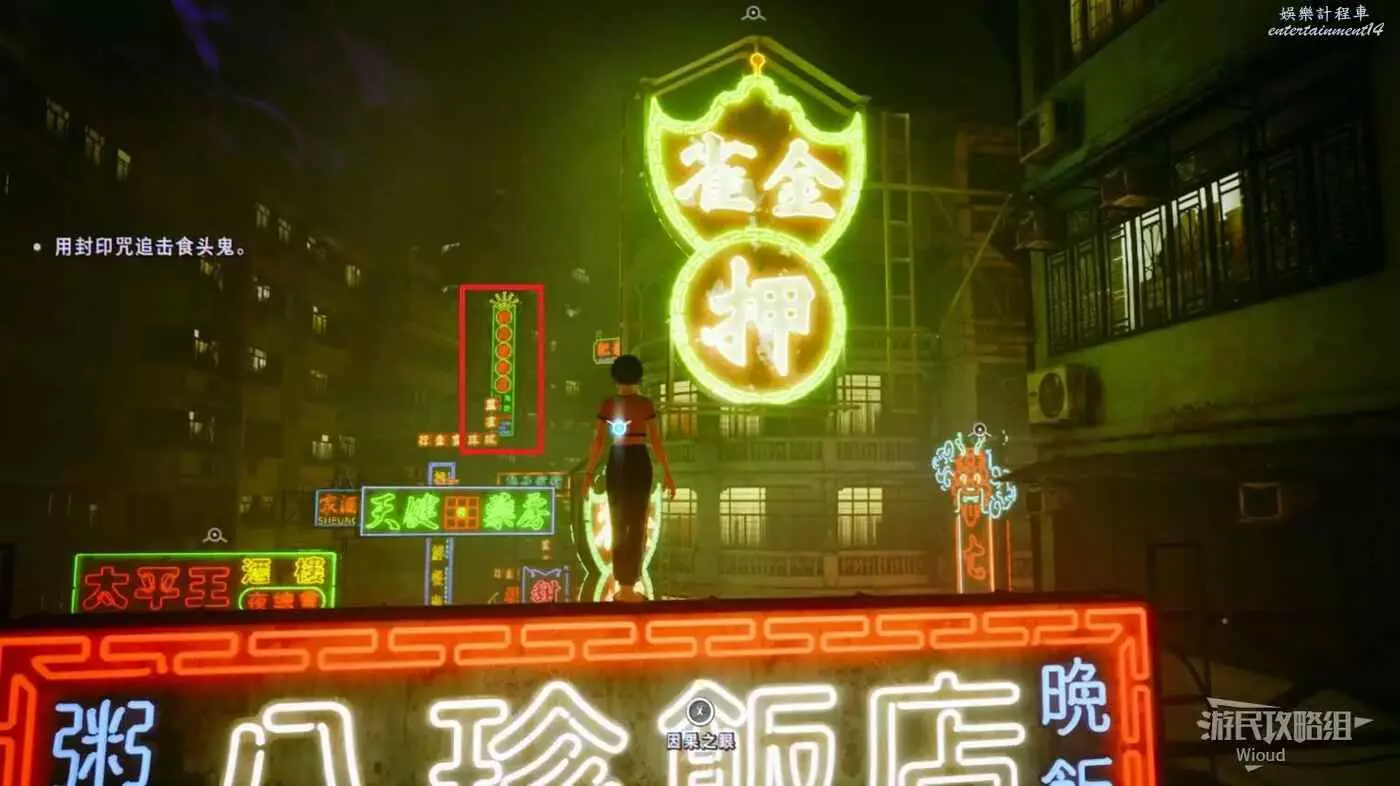 回到市場主幹道跳燈牌,跳到下圖所示的綠邊長條燈牌旁邊,通過木架子上樓梯,此關卡的神龕就在樓頂。