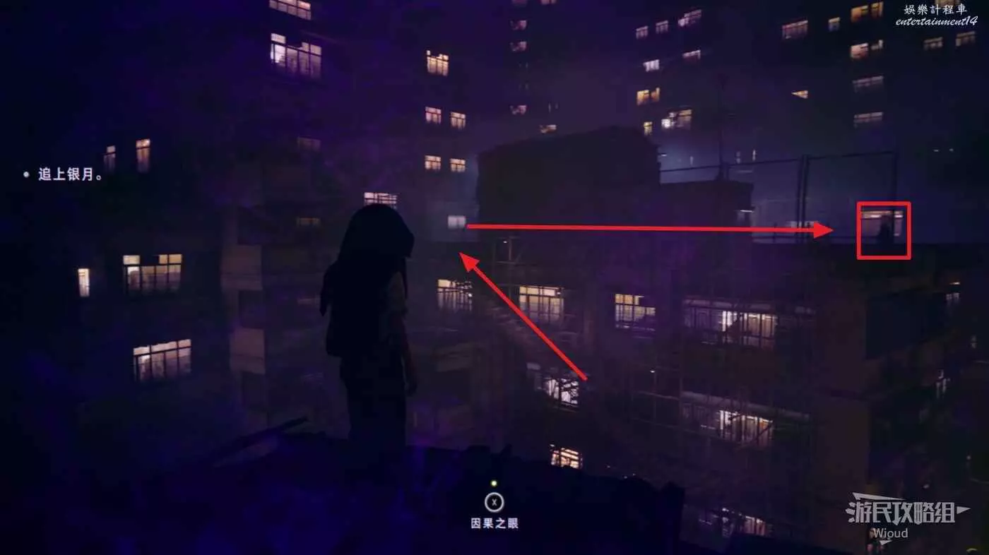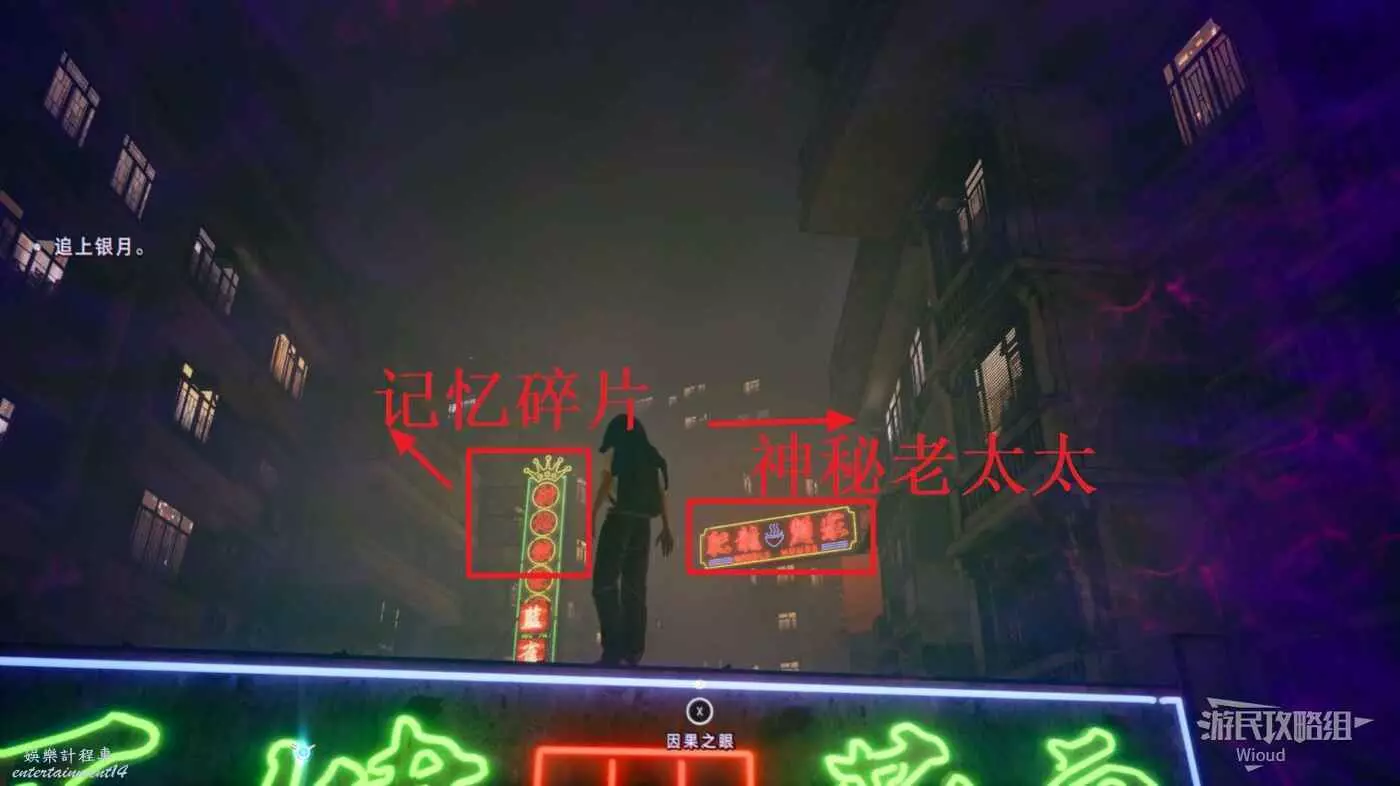 直接回到主幹道跳燈牌,肥龍面家右邊樓頂是神秘老太太的位置,新地館飯店燈牌左邊樓頂有一個記憶碎片,拿完這個記憶碎片往右邊的樓頂走,銀月就在這個記憶碎片右邊的樓頂。