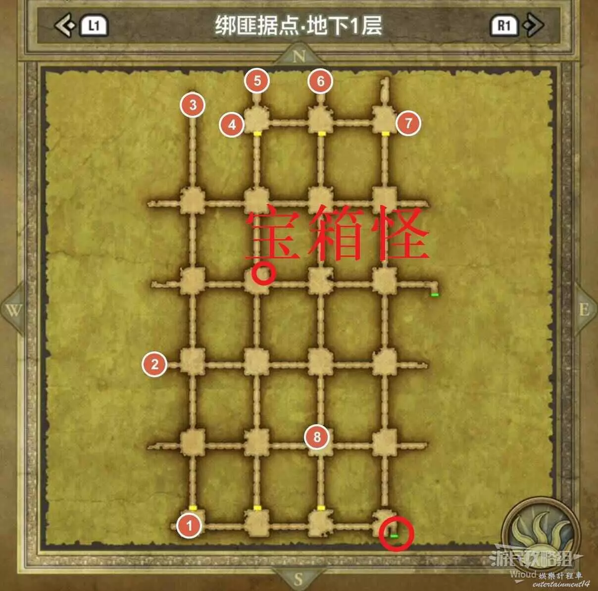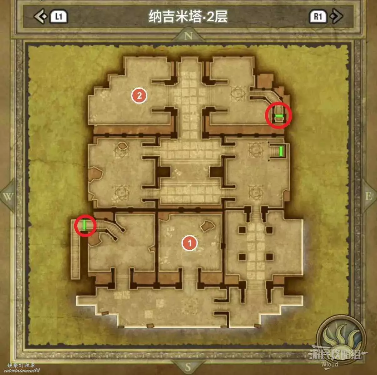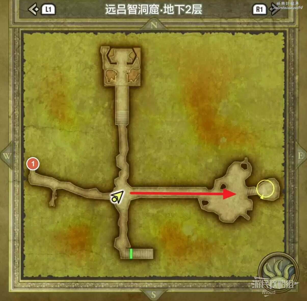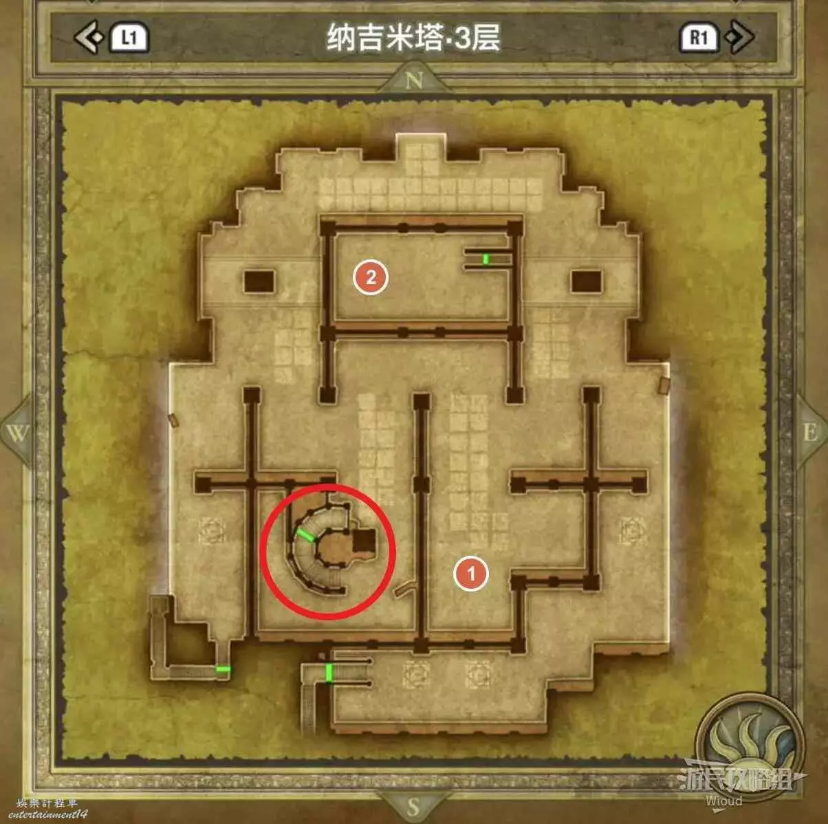 位於岩山洞窟二層,標識1處的寶箱可以獲得一個小徽章。