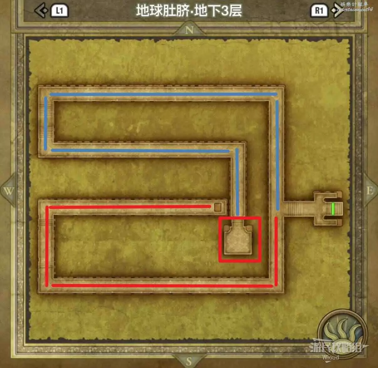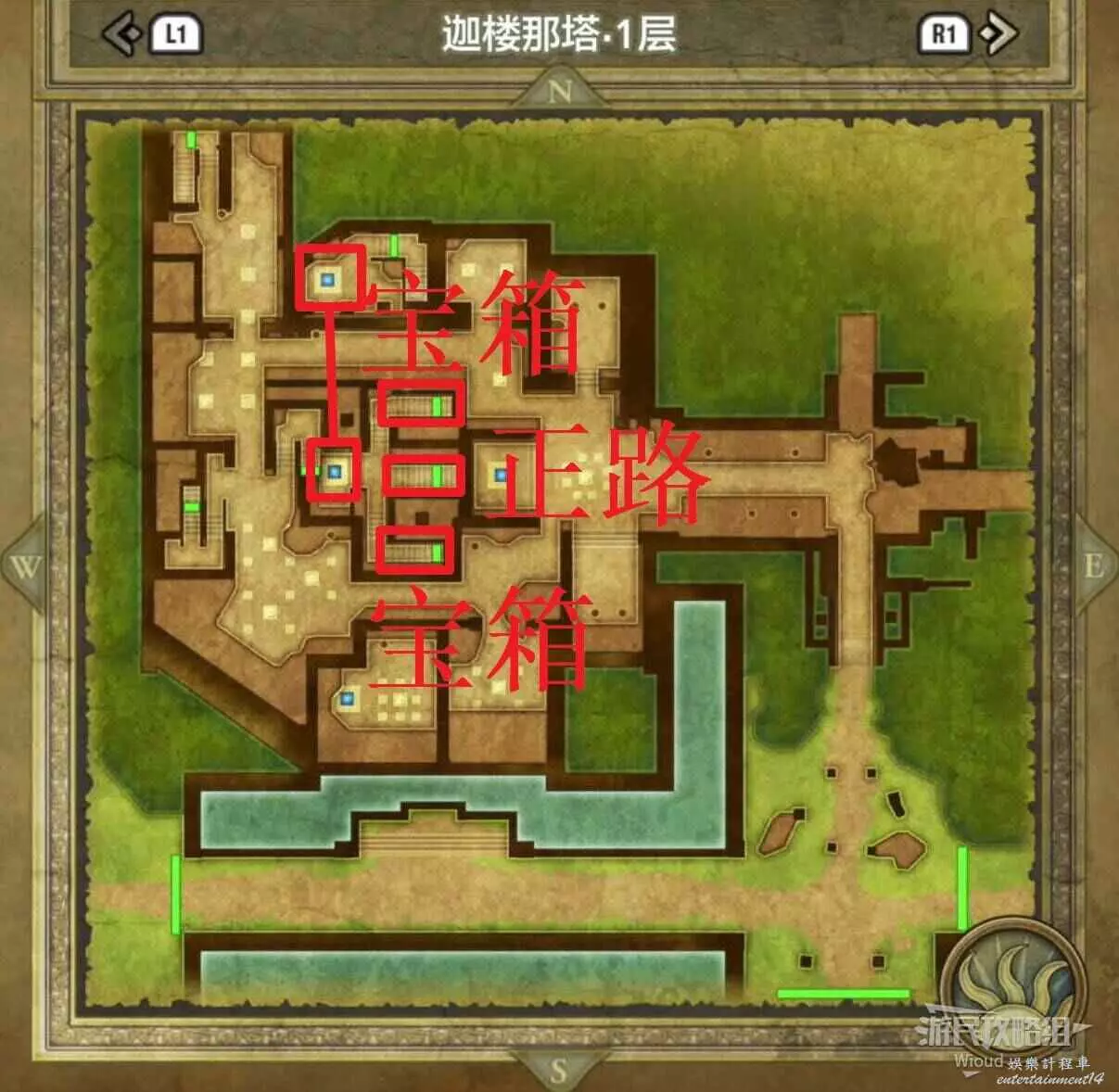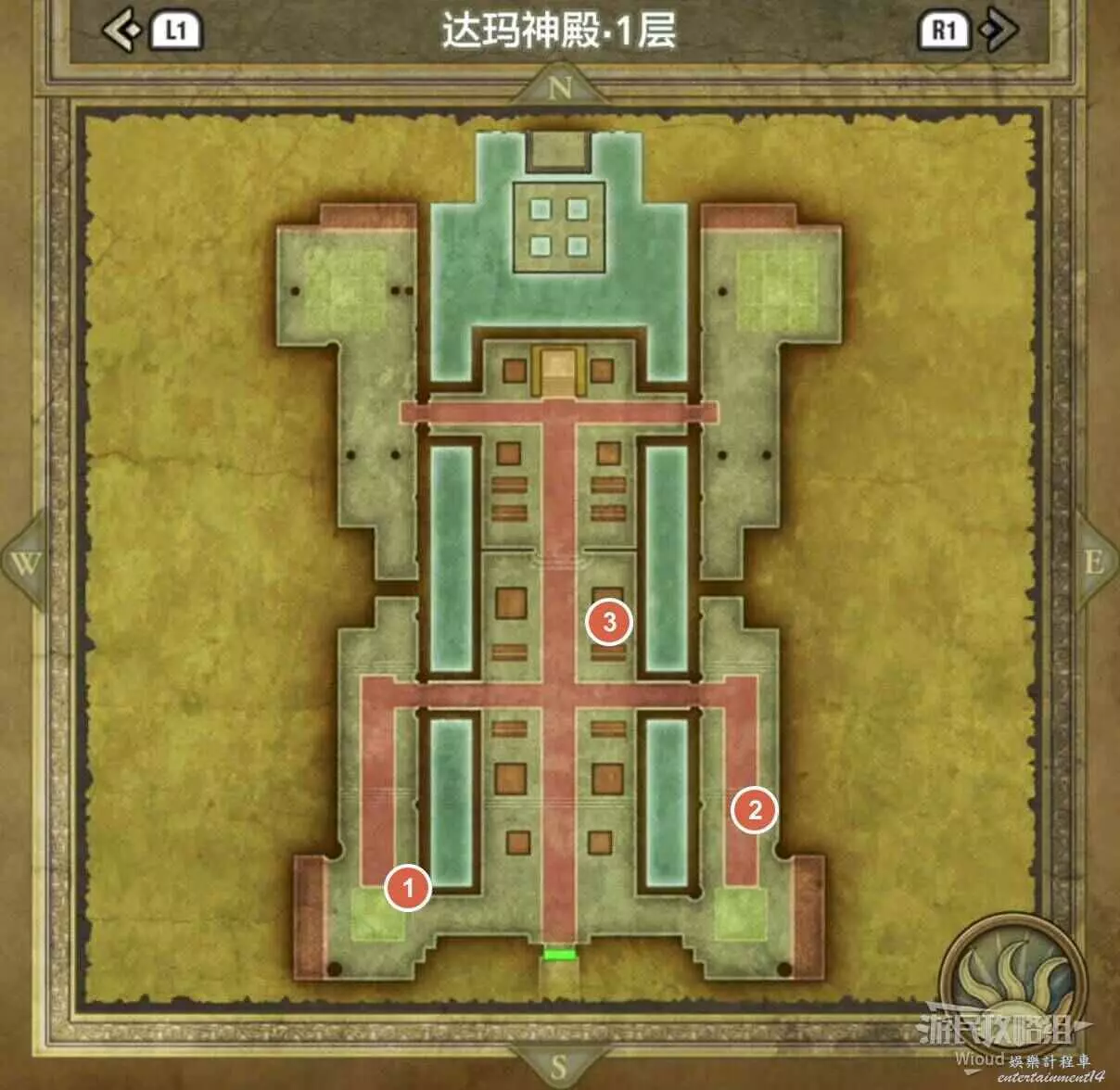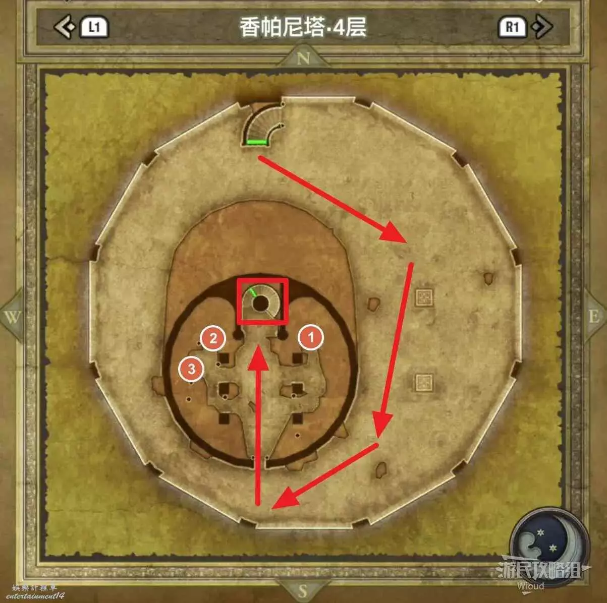 位於岩山洞窟二層,標識1處的寶箱可以獲得一個小徽章。