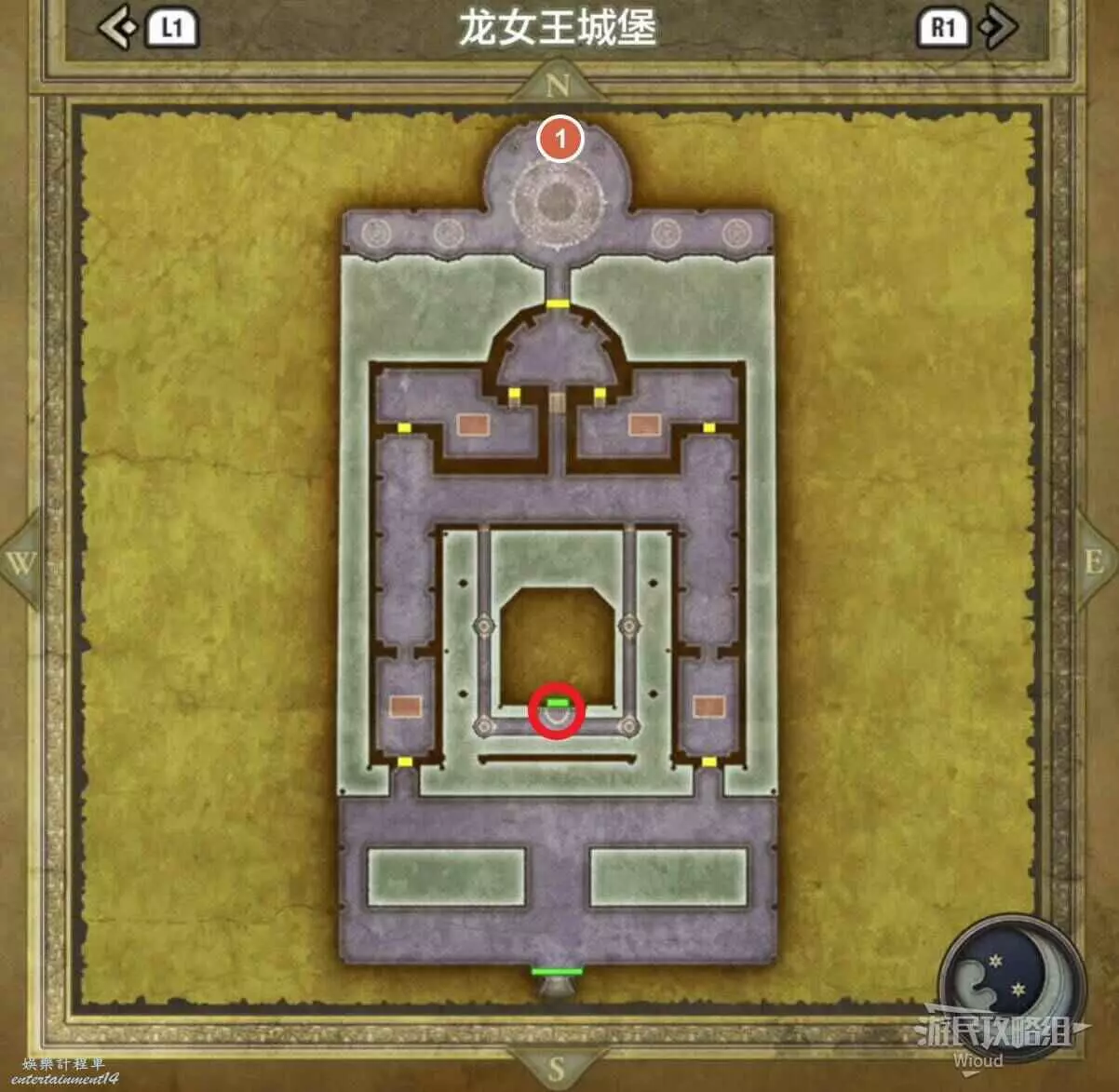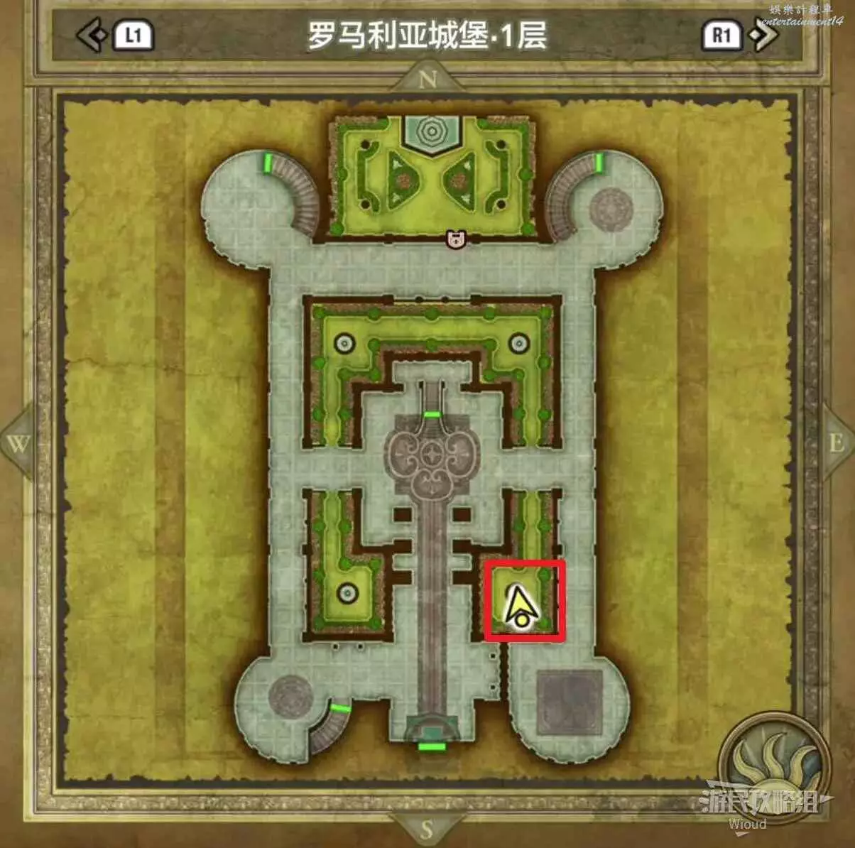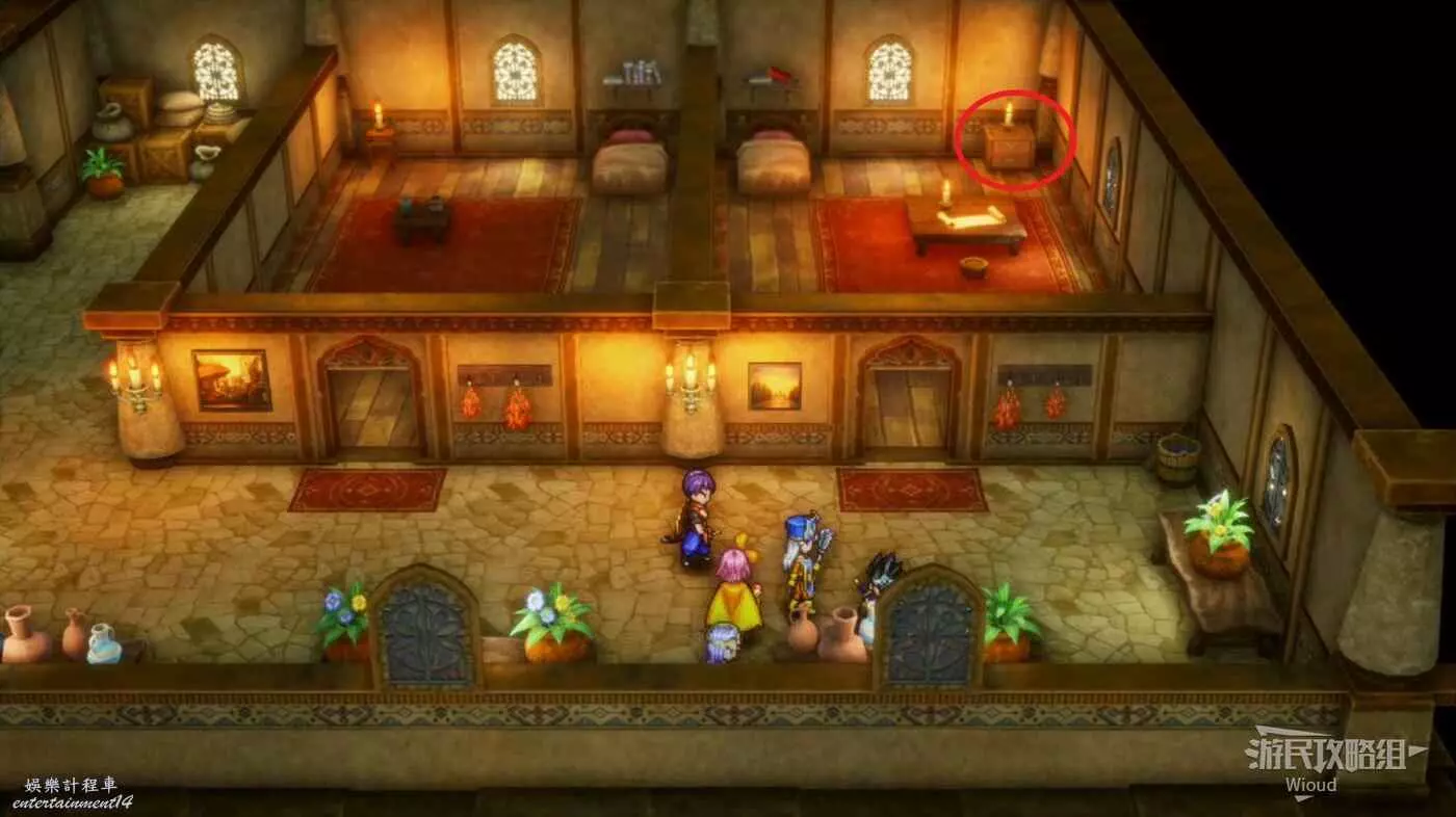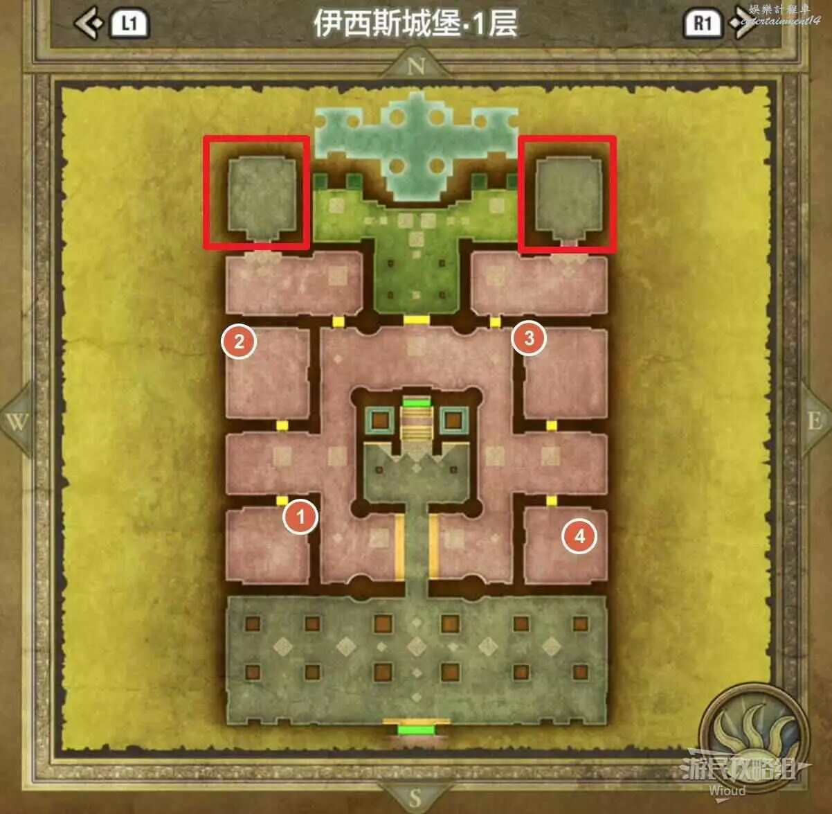 位於伊西斯城堡1層右上方紅框,房間有四個寶箱,白天有士兵看管,晚上可以直接拿,能開出來一個小徽章。