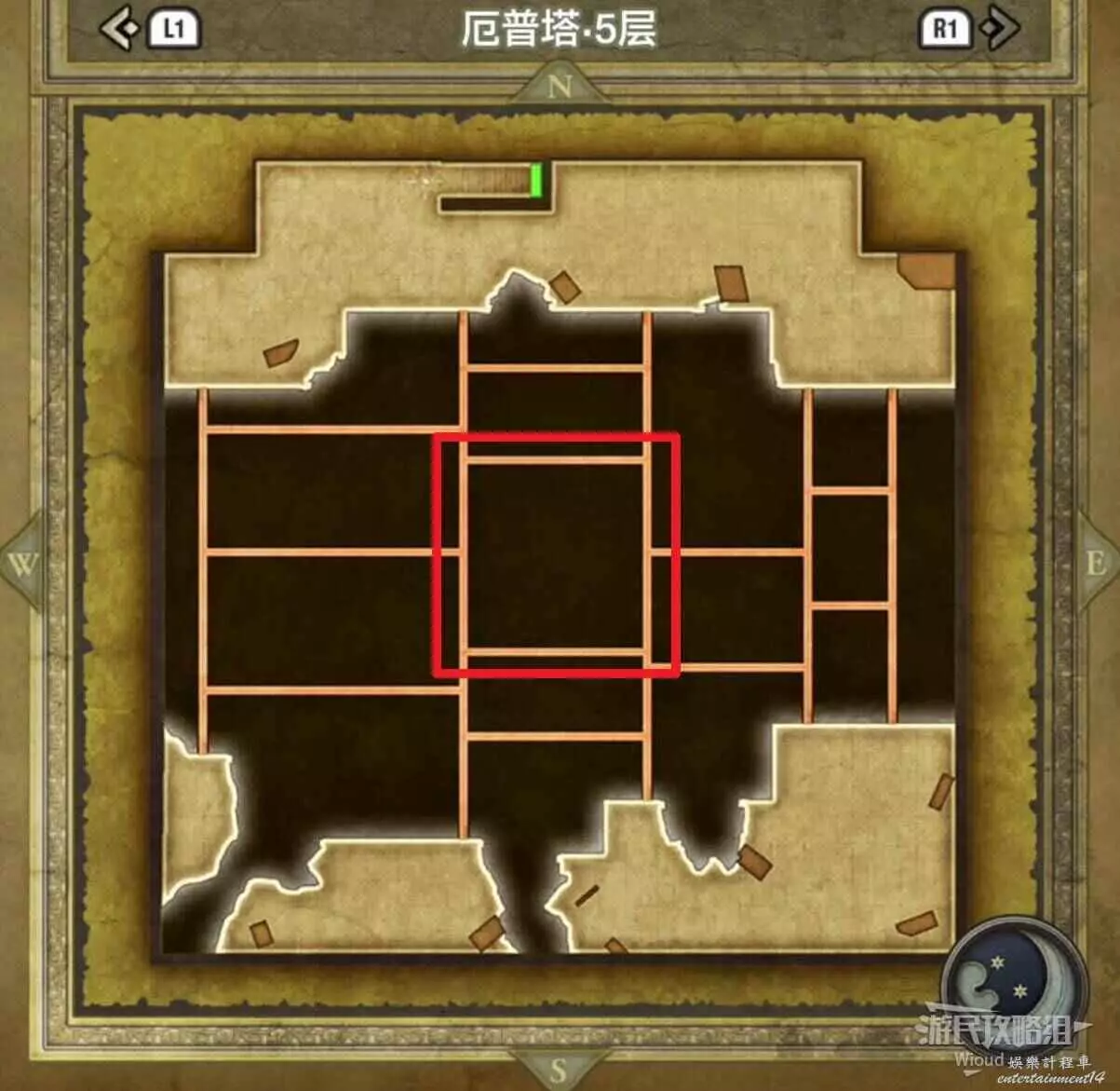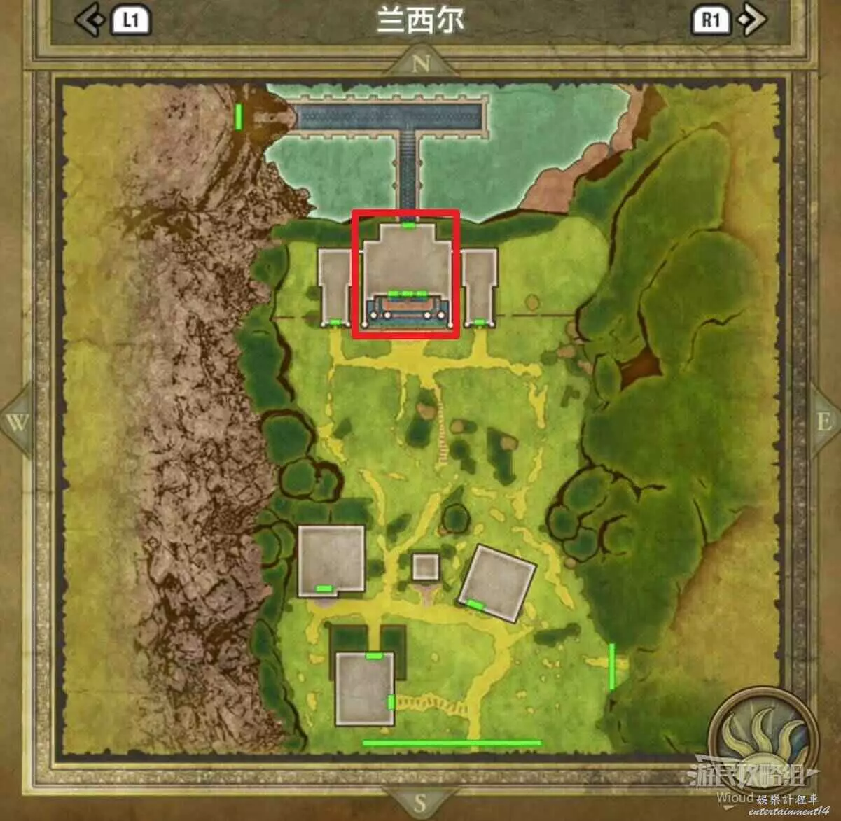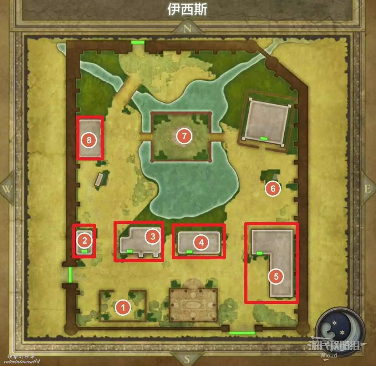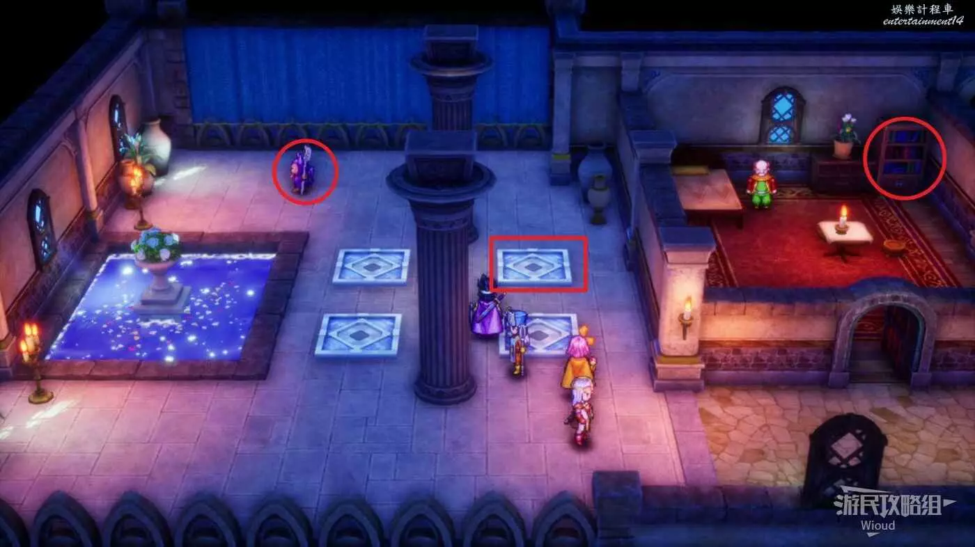 位於伊西斯城堡1層右上方紅框,房間有四個寶箱,白天有士兵看管,晚上可以直接拿,能開出來一個小徽章。