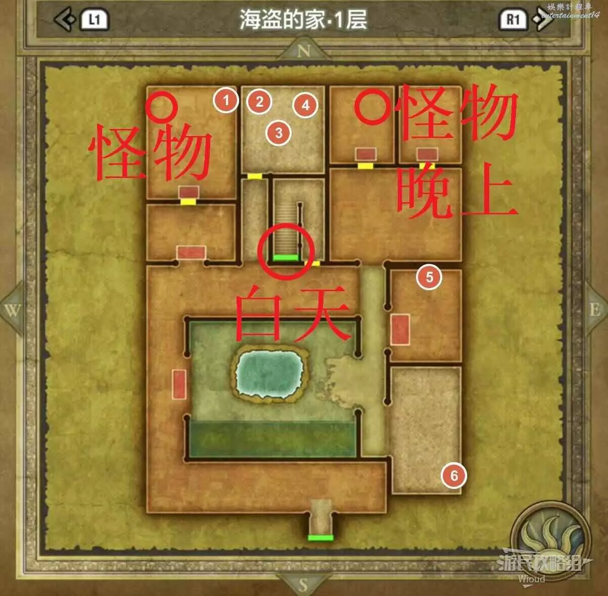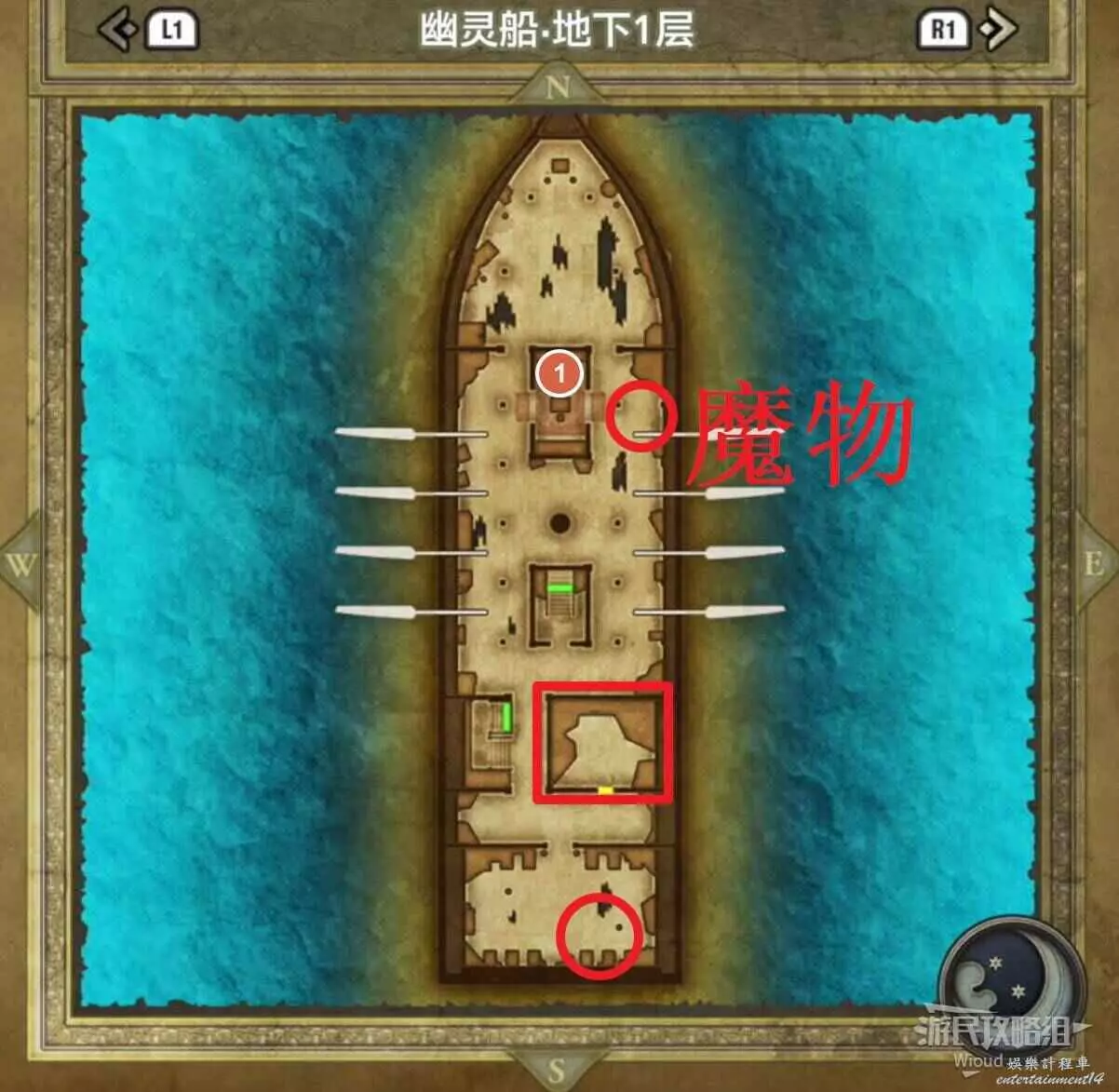 位於幽靈船地下一層,右下角紅框所示房間有很多寶箱與罐子可以打開,裡面可以獲得一個小徽章。