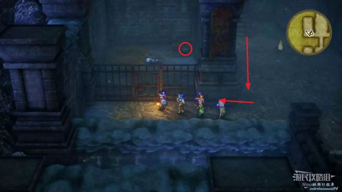 進入建築後,房間左上角的魔物只有白天才會出現,然後走建築地圖中間的樓梯來到下層,與右側牢房的右牆角互動可以獲得一個小徽章。
