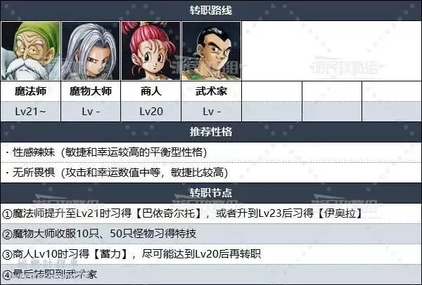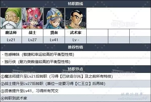 全能型角色的轉職路線是先使用魔法師,然後轉職成戰士和賢者,最終轉職為武術家。在學會推圖非常有用的「巴依奇爾托」和「仁王立」後,就能以最短路線轉職成全能型武術家。