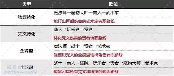 特化咒文傷害的轉職路線是先轉職成商人和玩樂者,最後再轉職成賢者。商人主要在前期使用並擁有不錯的耐性數值,之後轉職成玩樂者再轉賢者,無需使用領悟之書。