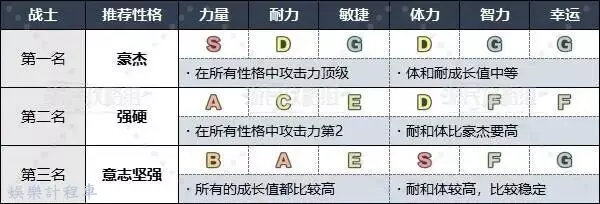 戰士的性格,如果特化攻擊的話可以選擇豪傑,想要兼具體力和耐力的話可以選擇強硬或意志堅強。為了最大限度地發揮物攻位的作用,推薦選擇力量成長率最高的性格。